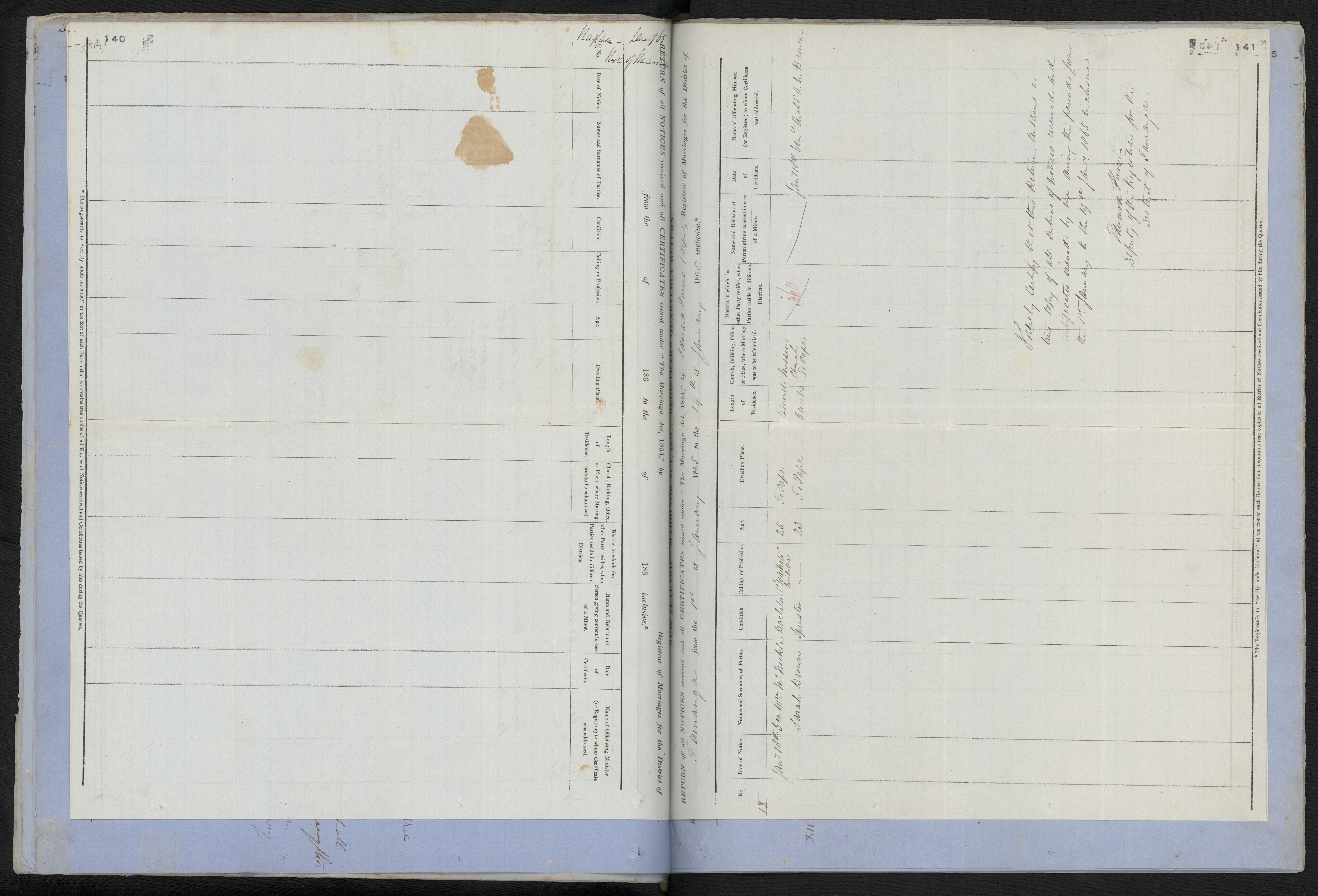 No Date of Notice Names and Surnames of Parties BDM Match Condition Calling or Profession Age Dwelling Place Length of Residence Marriage Place Folio Consent Date of Certificate Officiating Minister