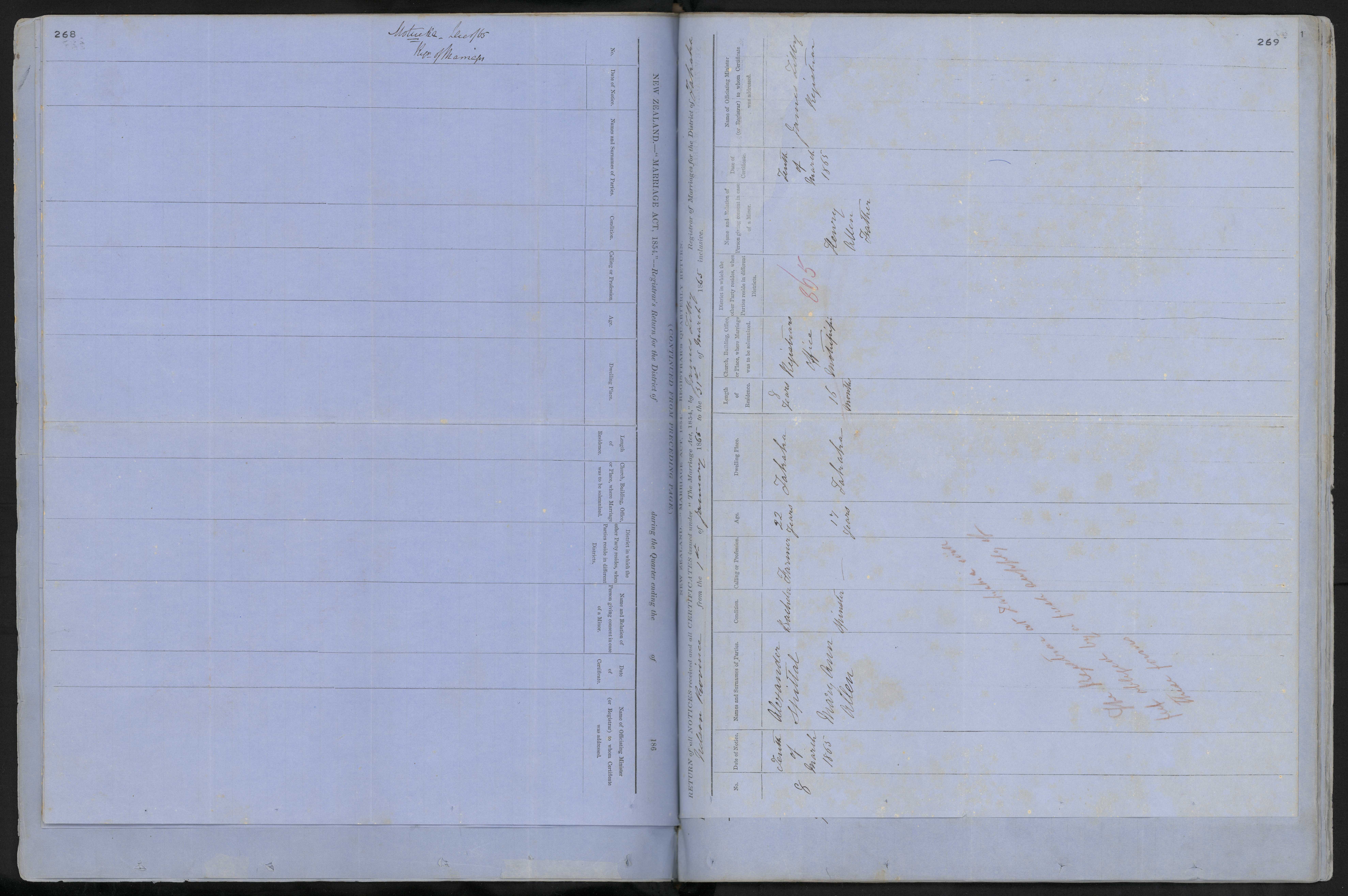 Registrars Office, Motupipi 865 Henry Allen, Father of [bride] Tenth of March 1865 James Tilly Registrar
