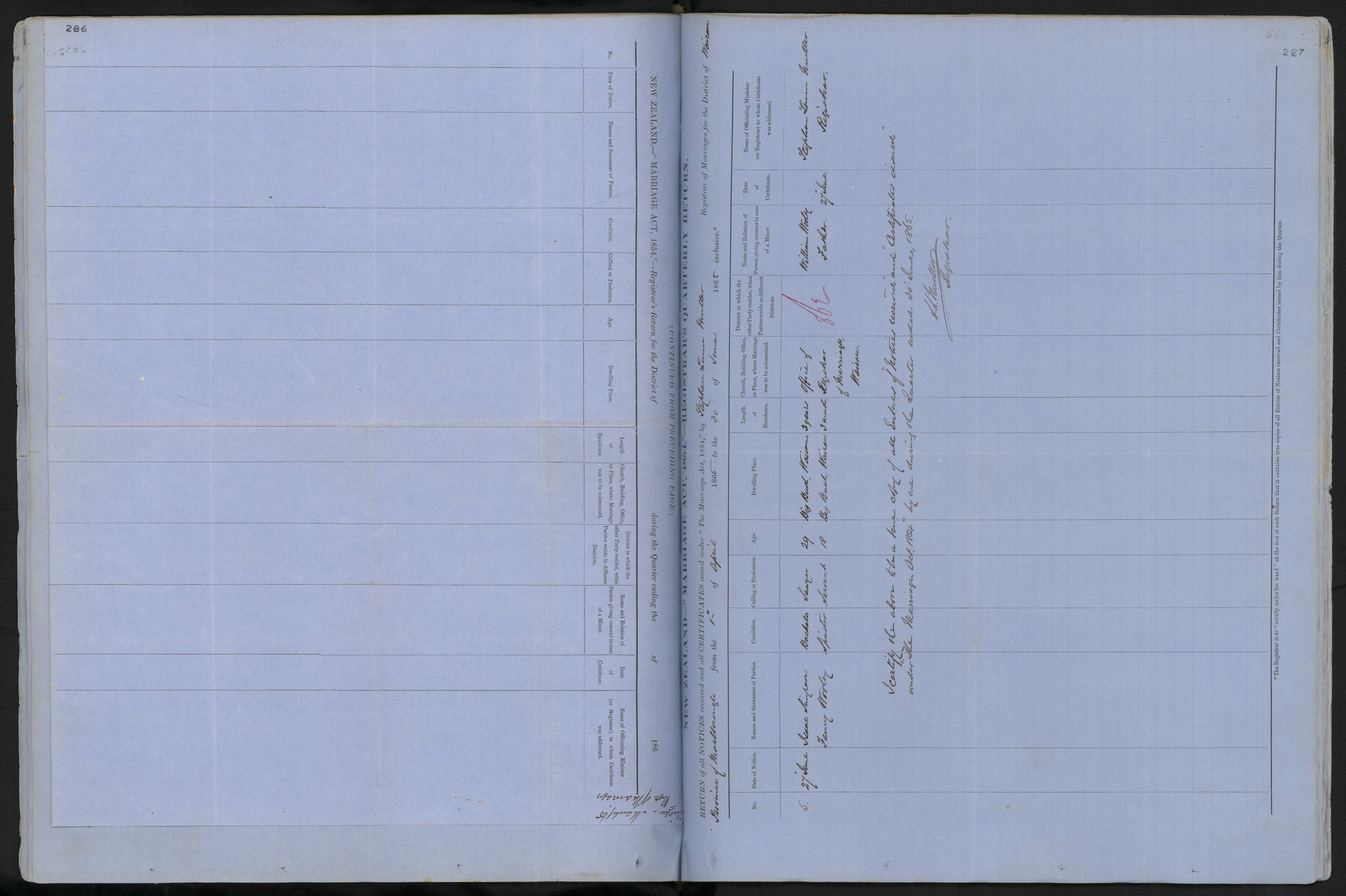 Office of Registrar of Marriages, Wairau. 865 William Wooley, Father 27 June 1865 Stephen Emm Muller, Registrar.
