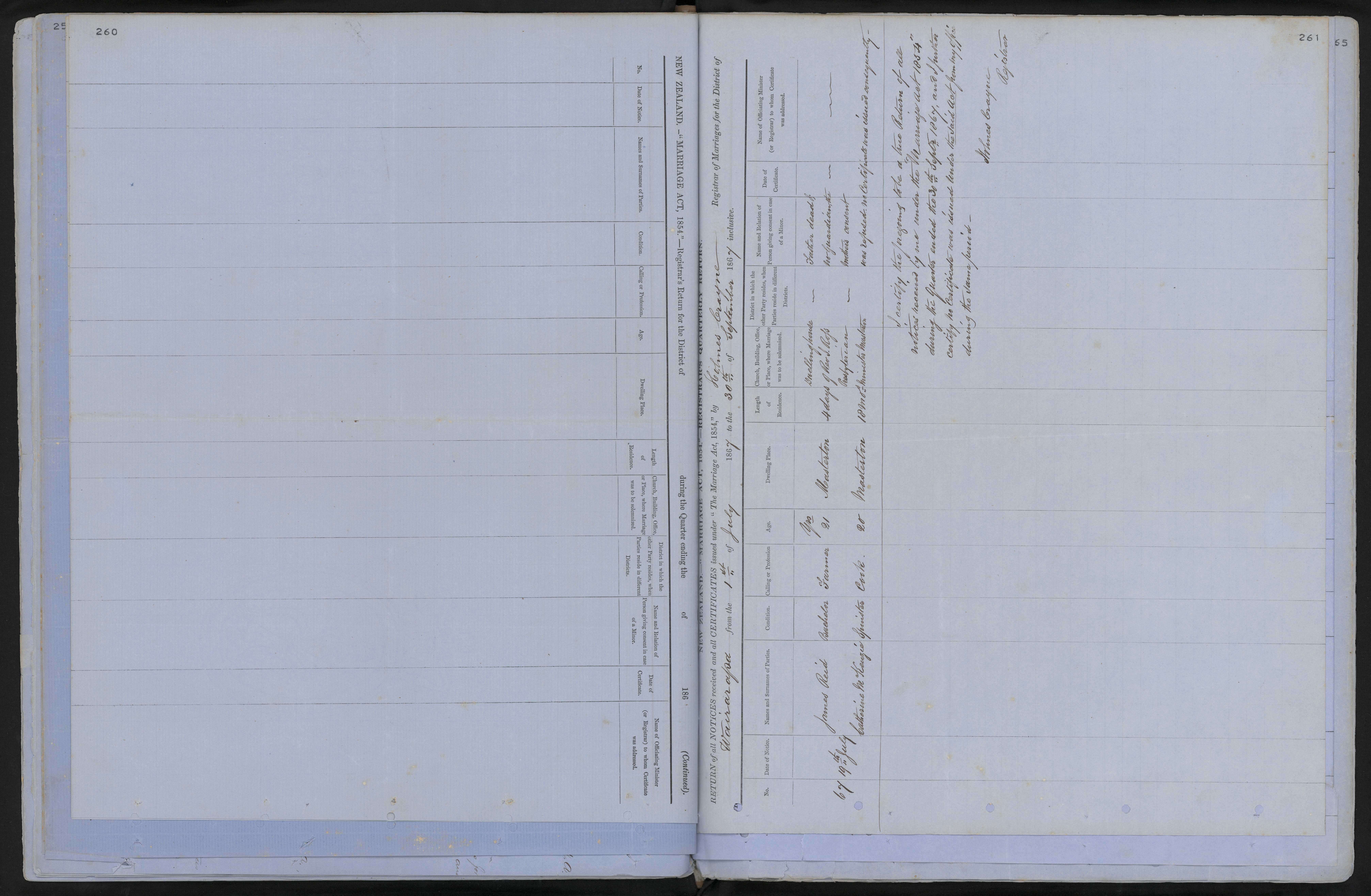 Dwelling house of Mr. Ross Presbyterian minister Masterton Father dead, no guardian, mother's consent was refused; no certificate was issued consequently.