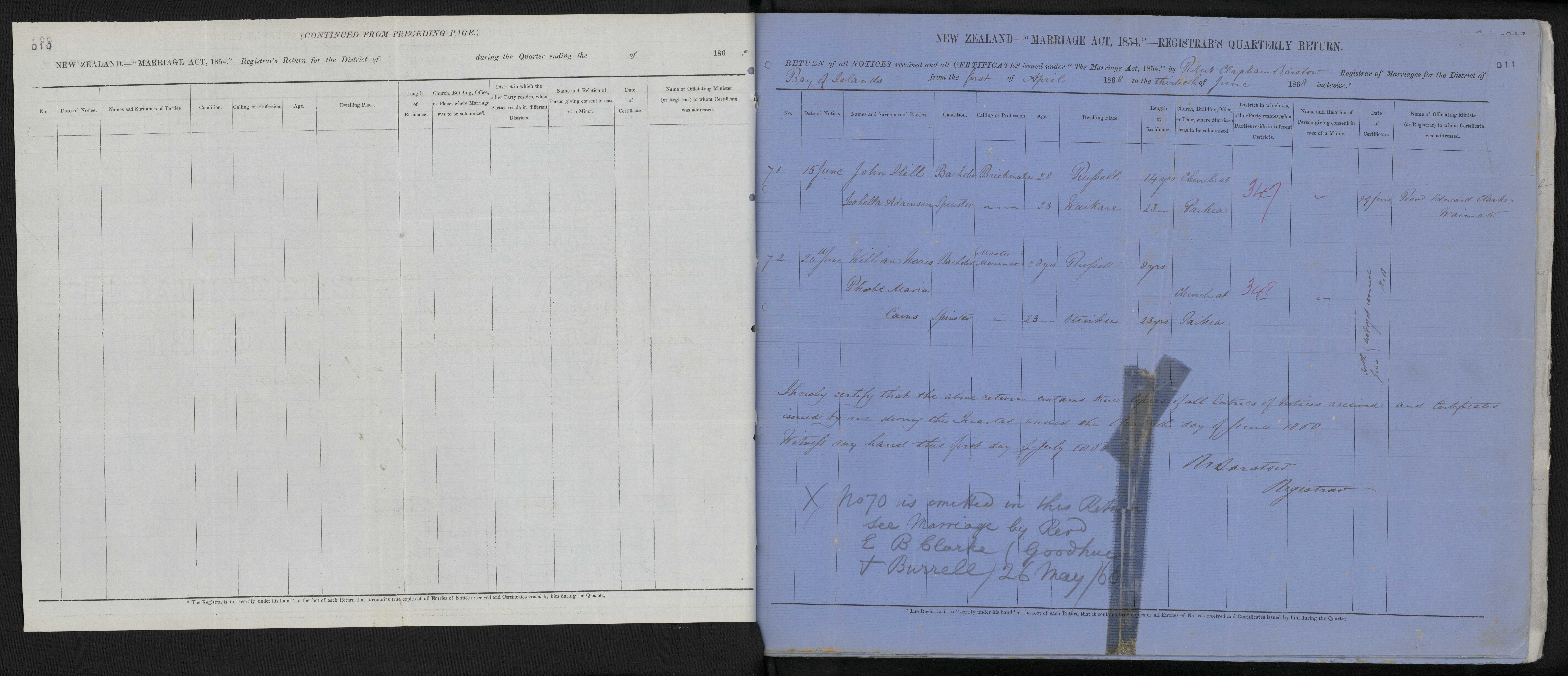 District of Bay of Islands Quarter ending 30 June 1868 Registrar Robert Clapham Barstow