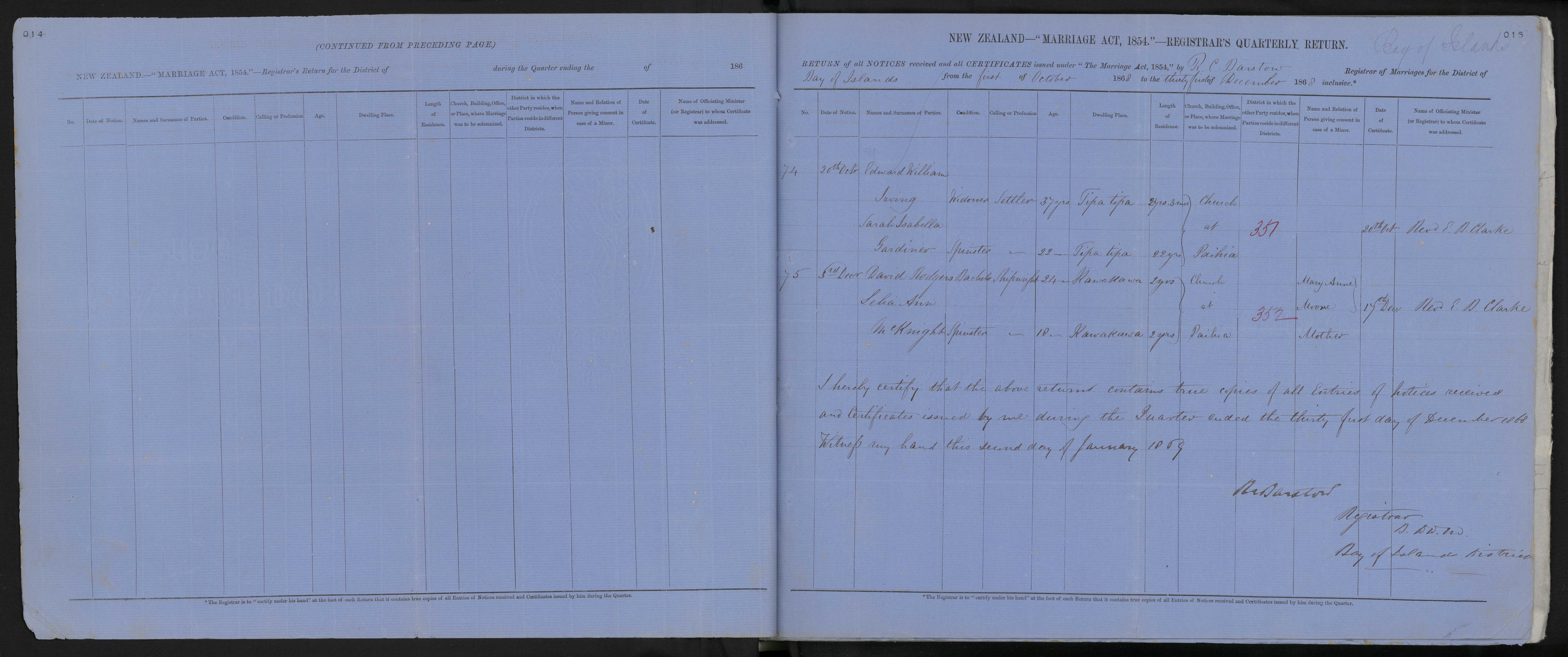 District of Bay of Islands Quarter ending 31 December 1868 Registrar R C Barstow