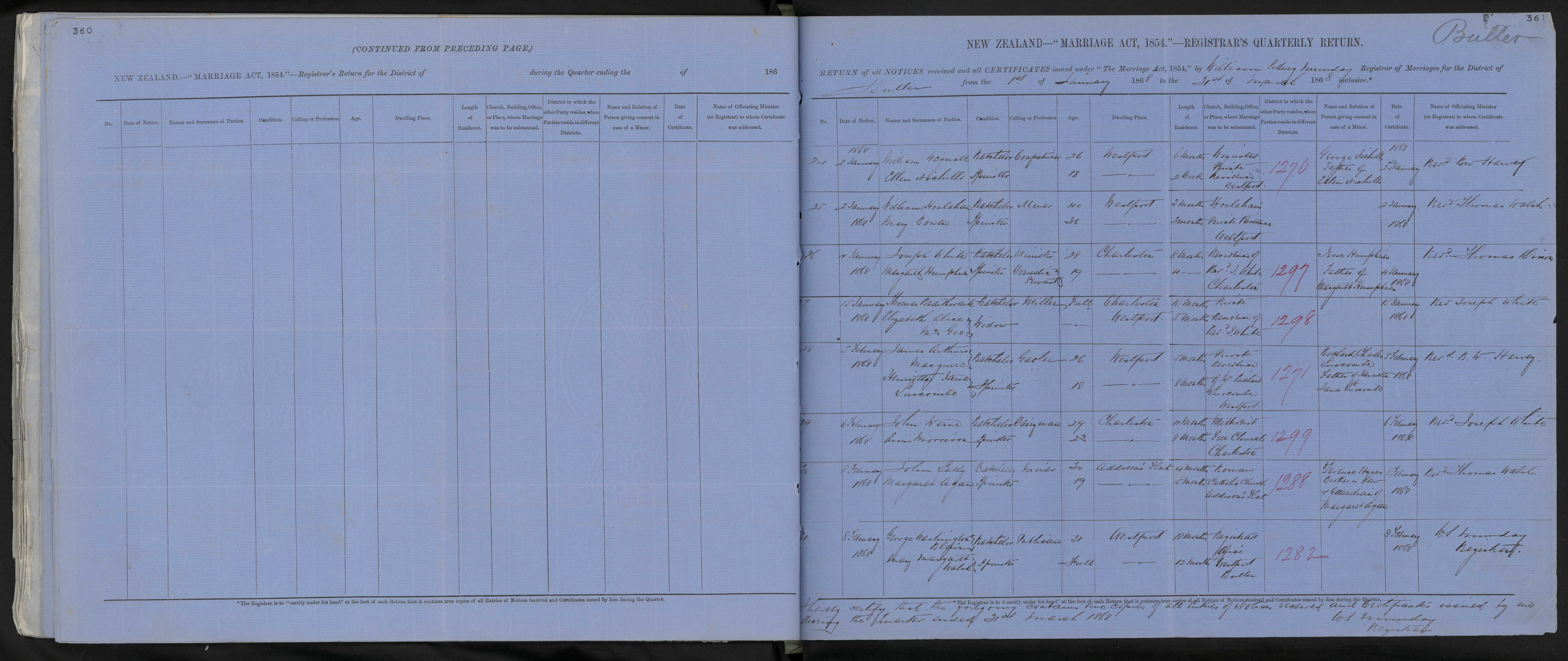 Registrar's Office, Westport, Buller | 68/1282 | 8 February 1868 | W. S Munday, Registrar | ||||||||||||||||||||||||||||||||||||||||||||||||||||||||