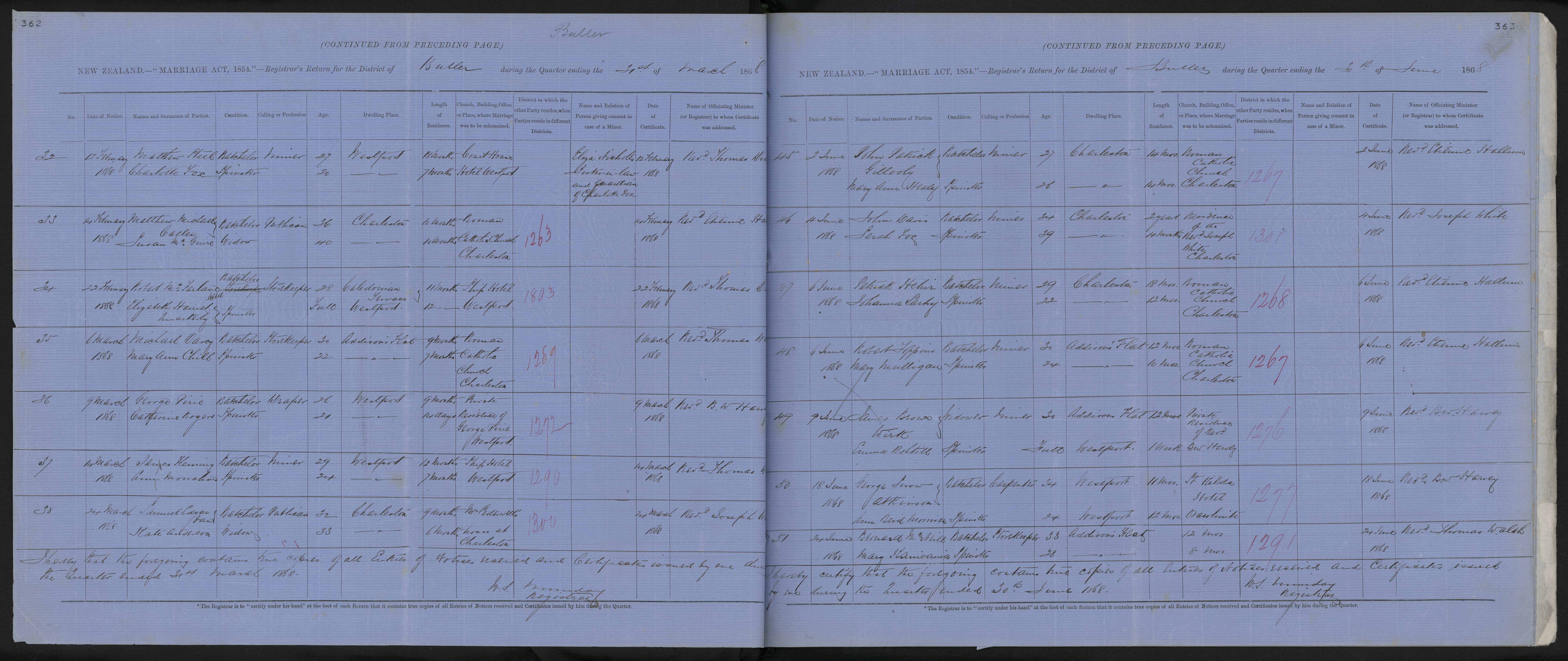 Roman Catholic Church, Charleston | 68/1263 | 14 February 1868 | Rev. Etienne Hallum | ||||||||||||||||||||||||||||||||||||||||||||||||||