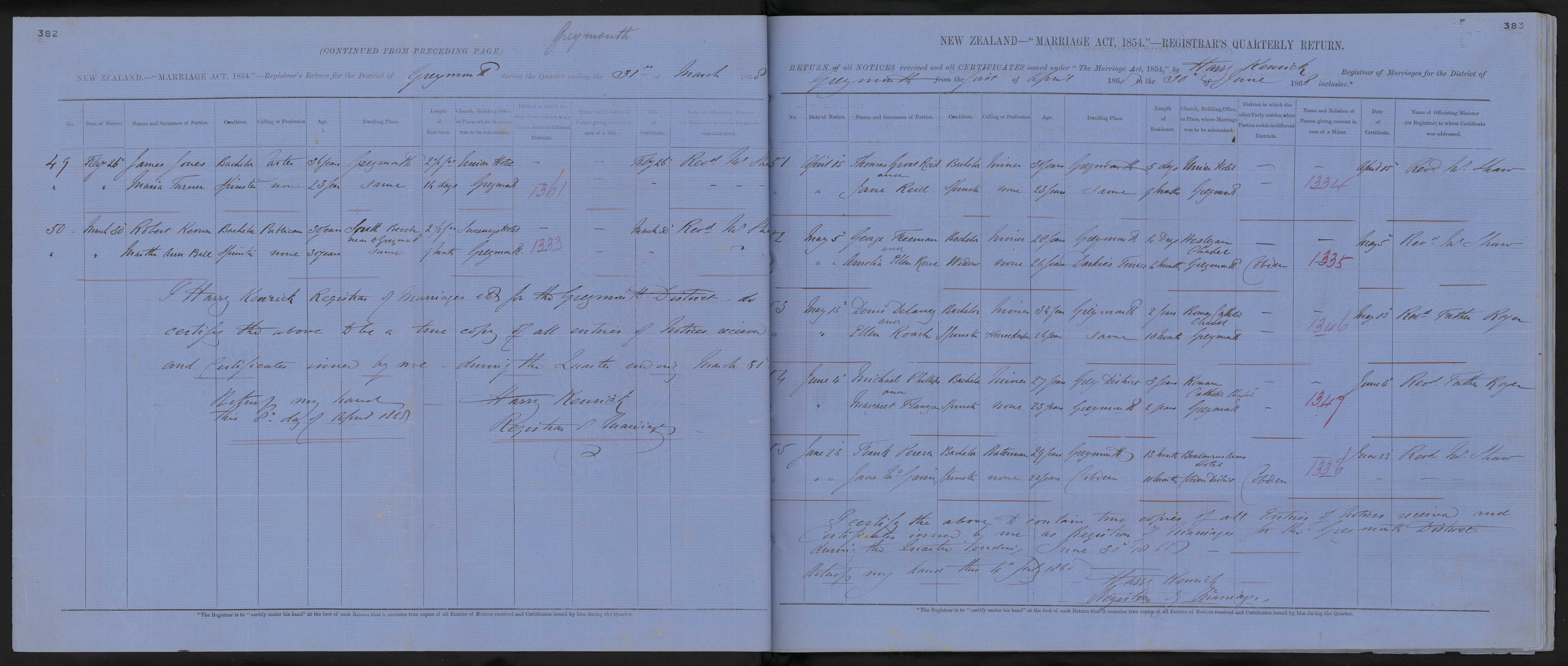 District of Greymouth Quarter ending 30 June 1868 Registrar Harry Kenrick