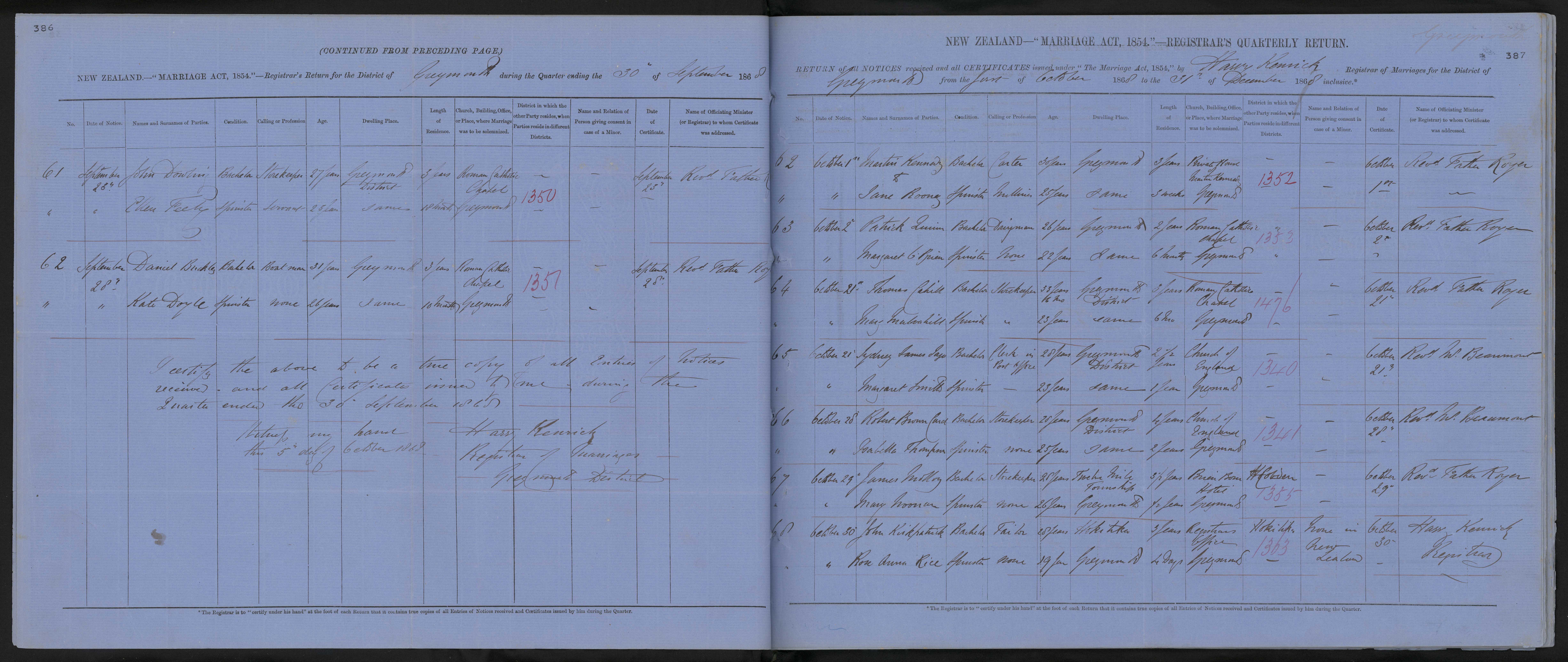 Registrars Office Greymouth | 68/1363 | None in New Zealand | 30 October 1868 | Harry Kenrick Registrar | |||||||||||||||||||||||||||||||||||||||||||||||||