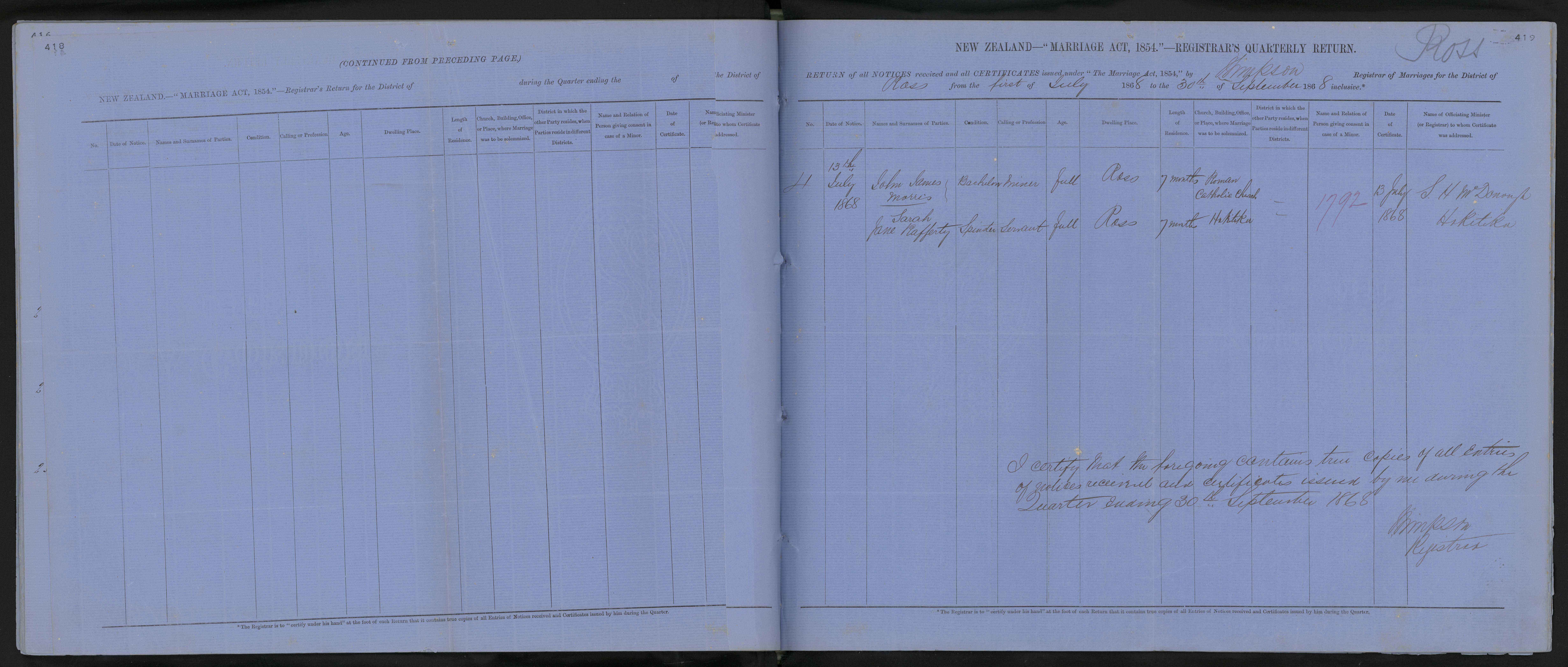 District of Ross Quarter ending 30 September 1868 Registrar J Simpson