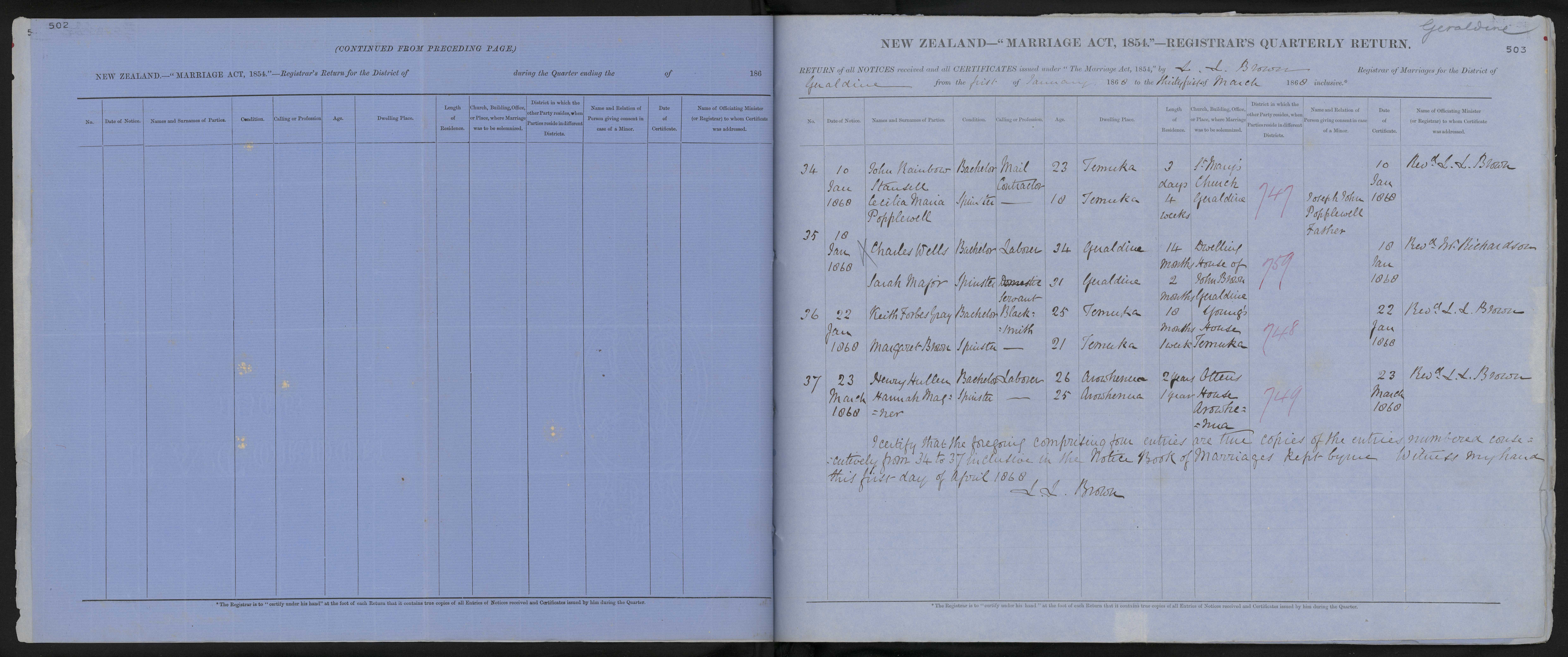 District of Geraldine Quarter ending 31 March 1868 Registrar L L Brown