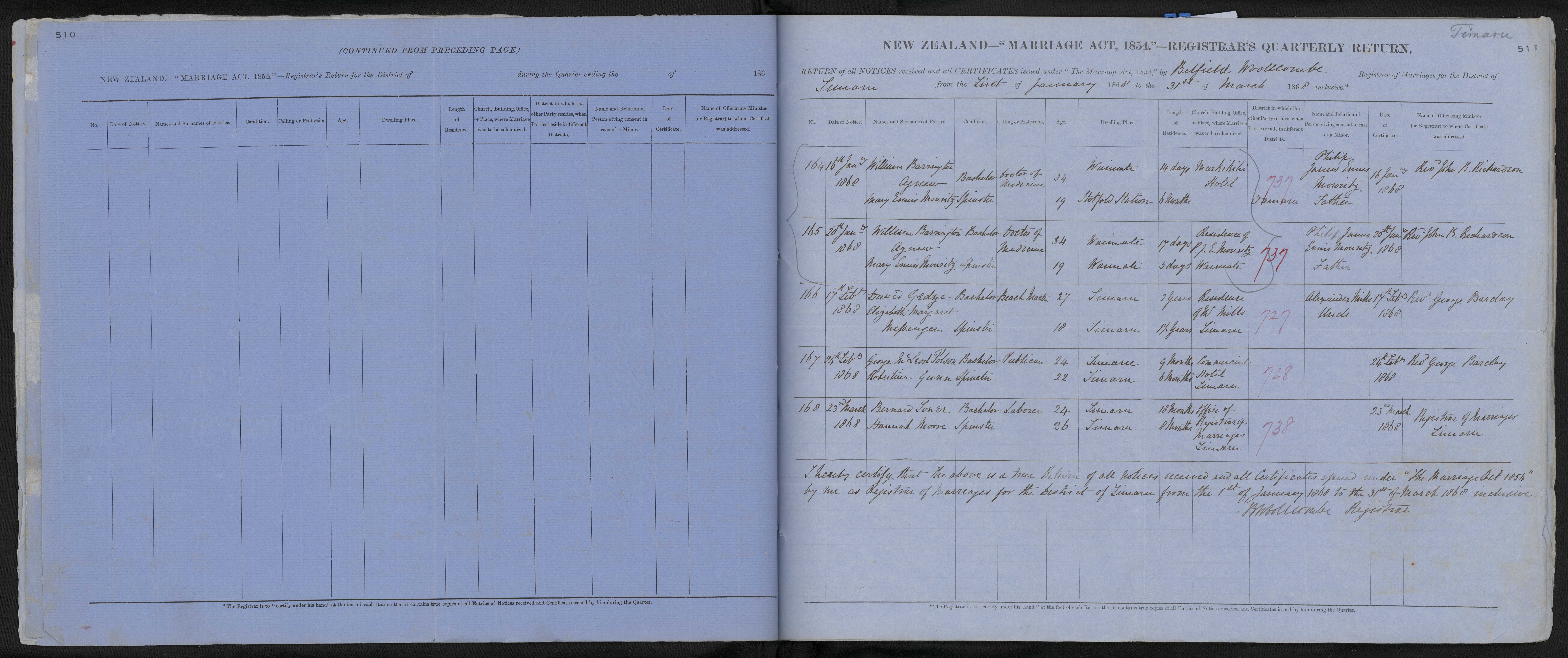 Office of Registrar of Marriages 738 23 March 1868 Registrar of marriages Timaru