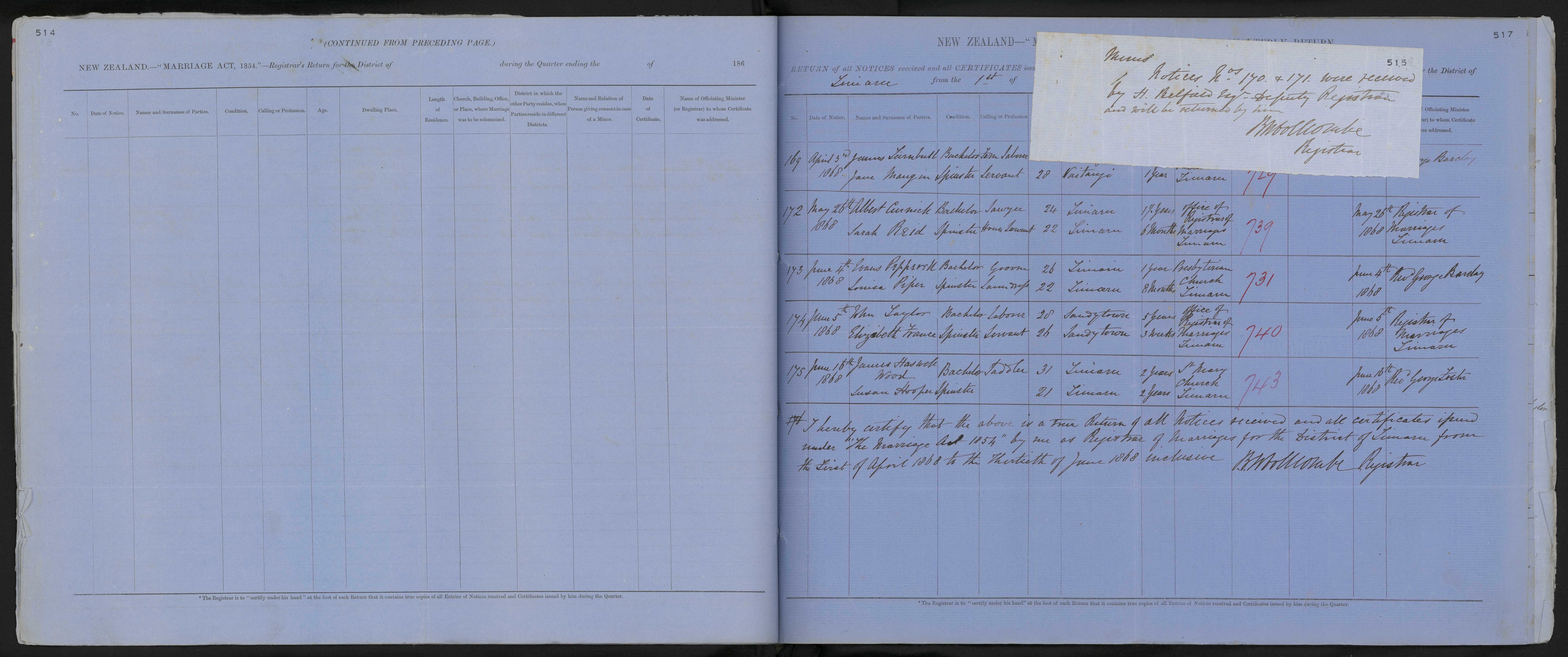 Office of Registrar of Marriages Timaru 740 5 June 1868 Registrar of Marriages Timaru