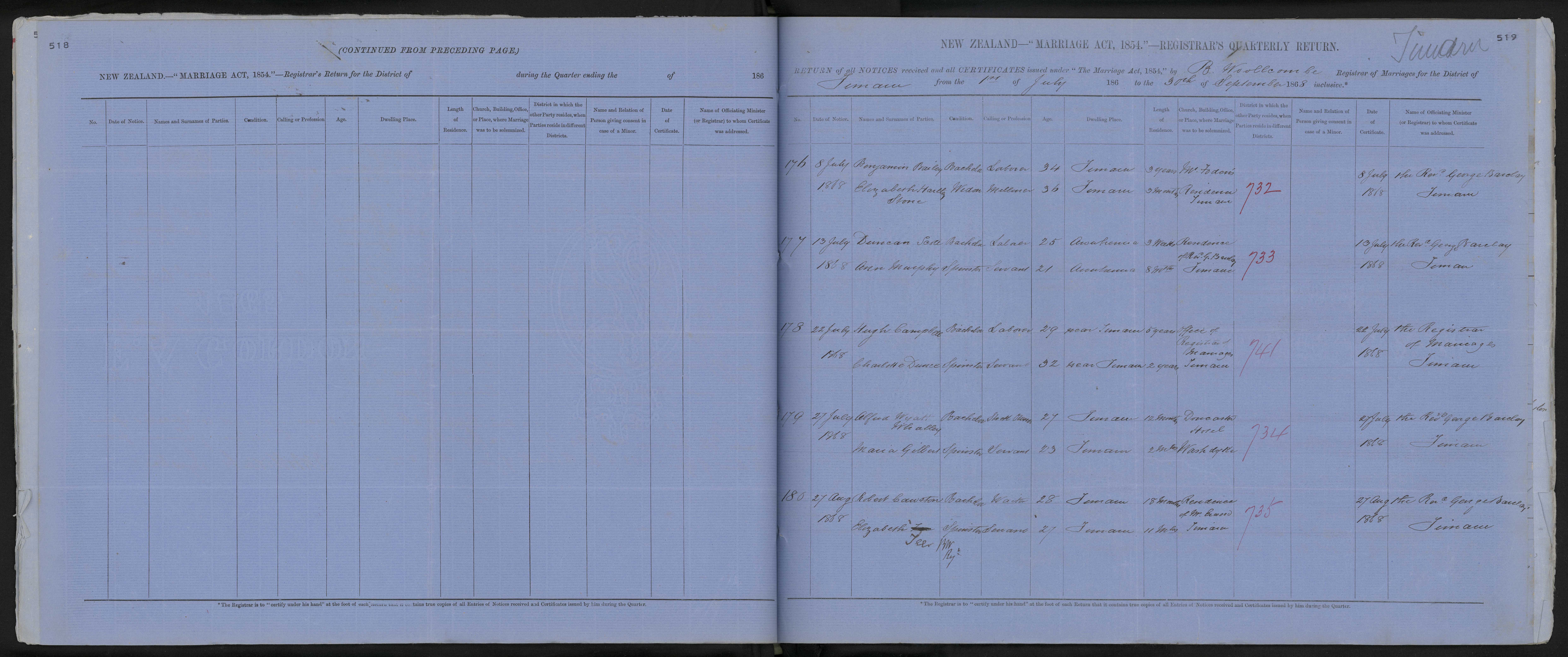 Office of Registrar of Marriages Timaru 741 22 July 1868 The Registrar of Marriages