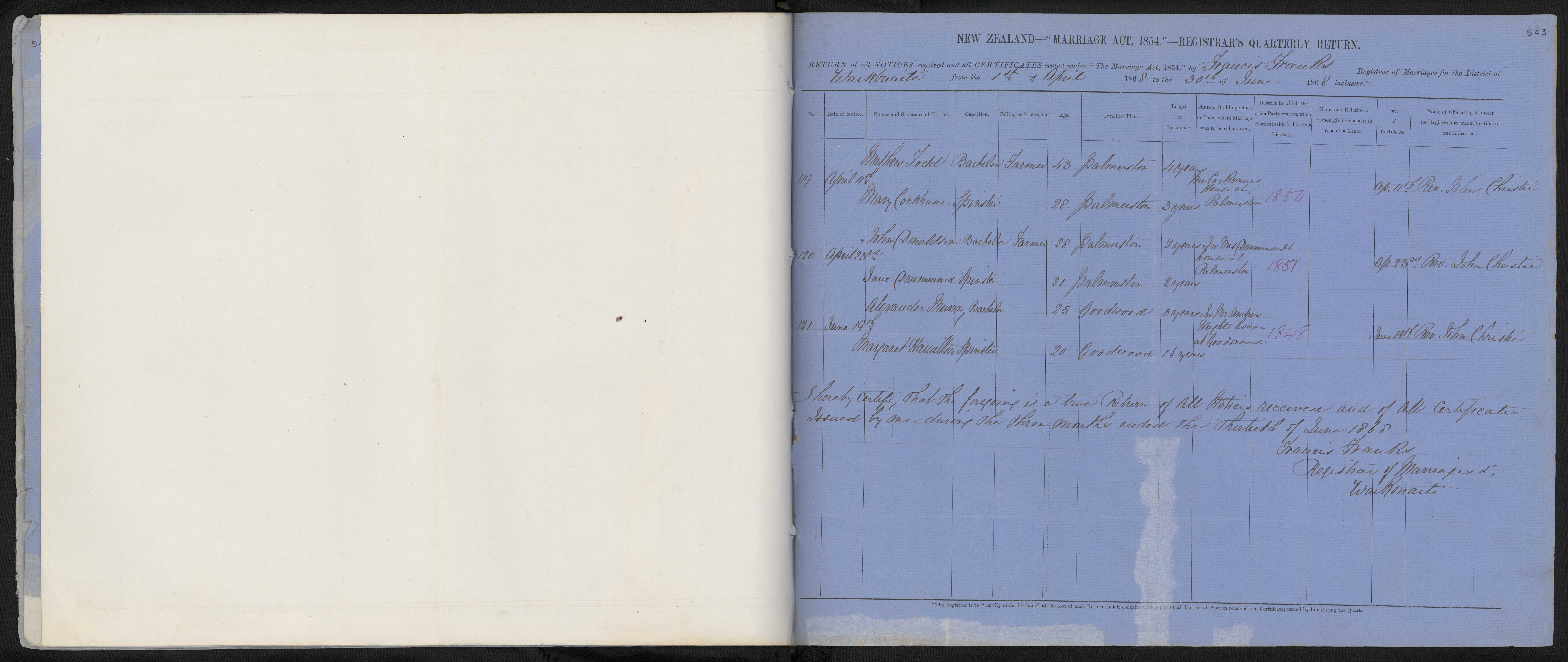 District of Waikouaiti Quarter ending 30 June 1868 Registrar Francis Franks