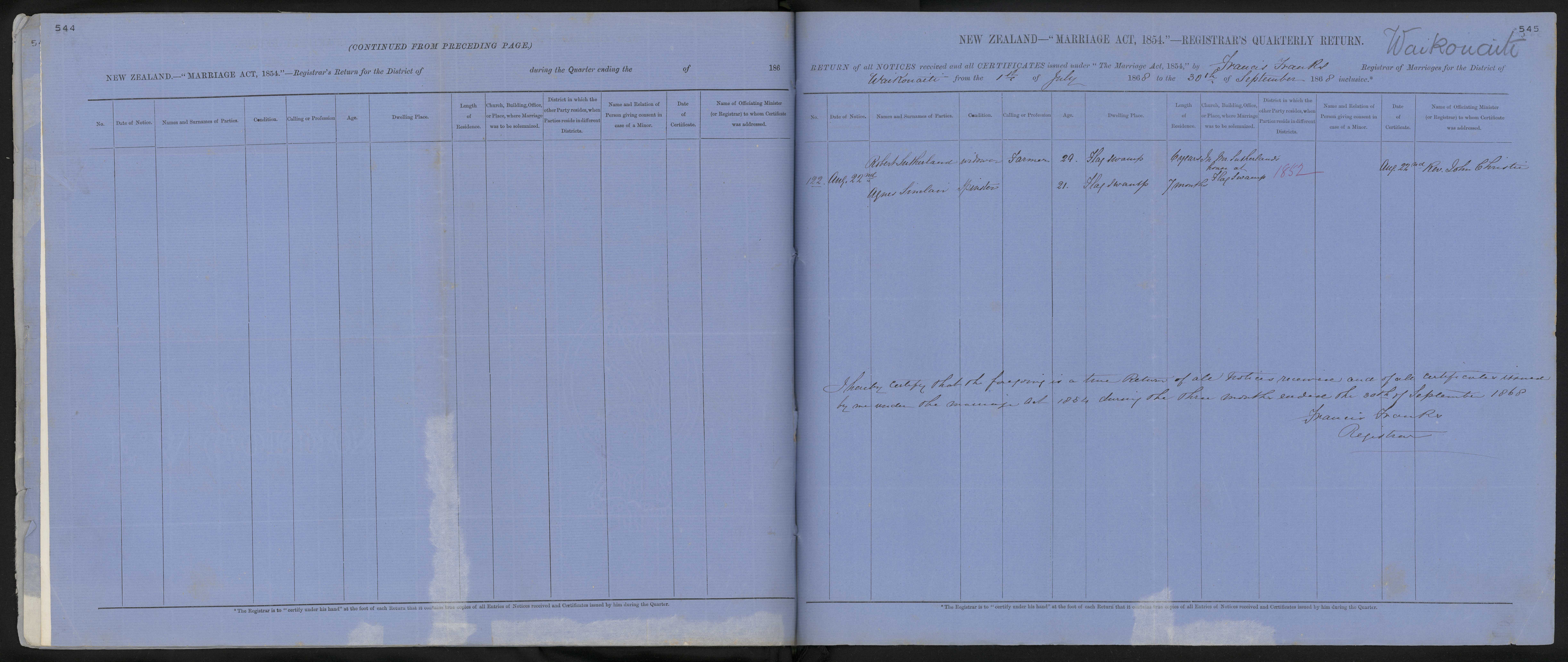 District of Waikouaiti Quarter ending 30th September 1868 Registrar Francis Franks