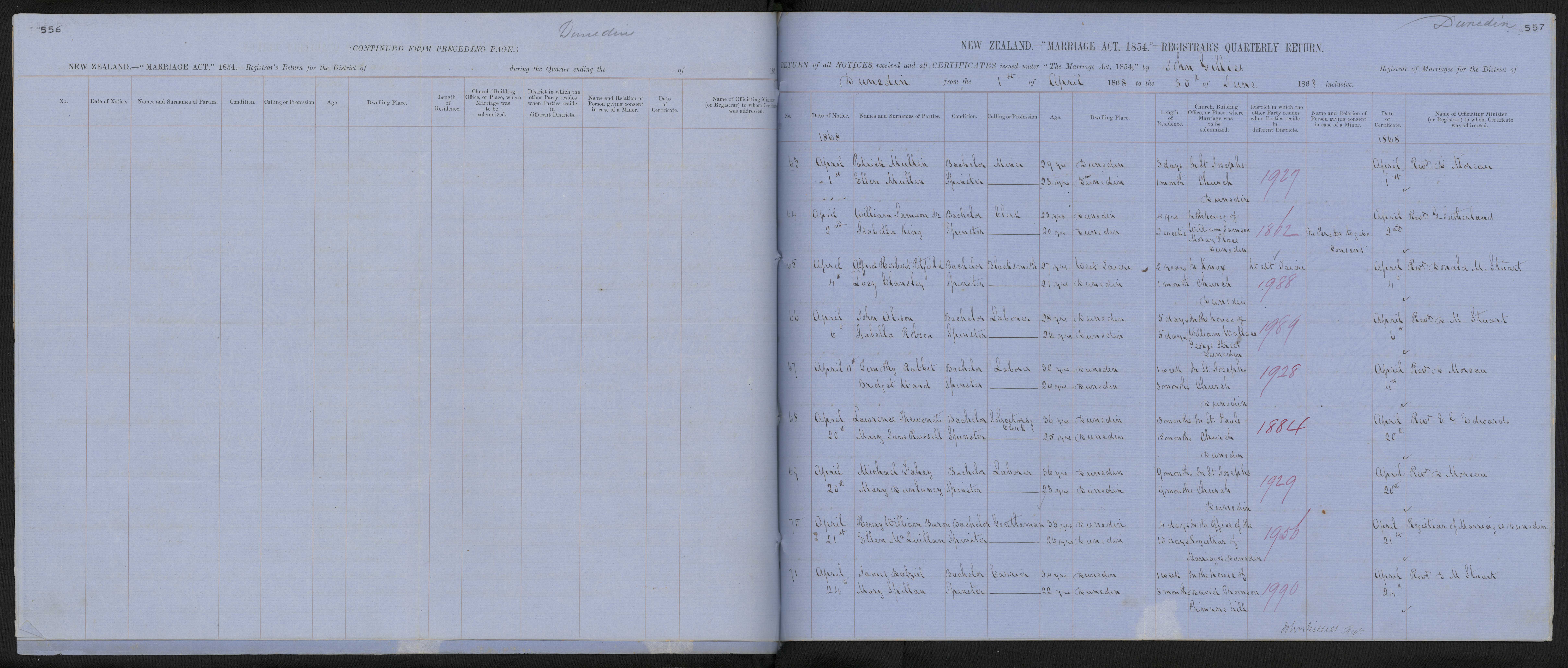 In the office of the Registrar of Marriages Dunedin | 68/1956 | 21 April 1868 | Registrar of Marriages Dunedin | ||||||||||||||||||||||||||||||||||||||||||||||||||