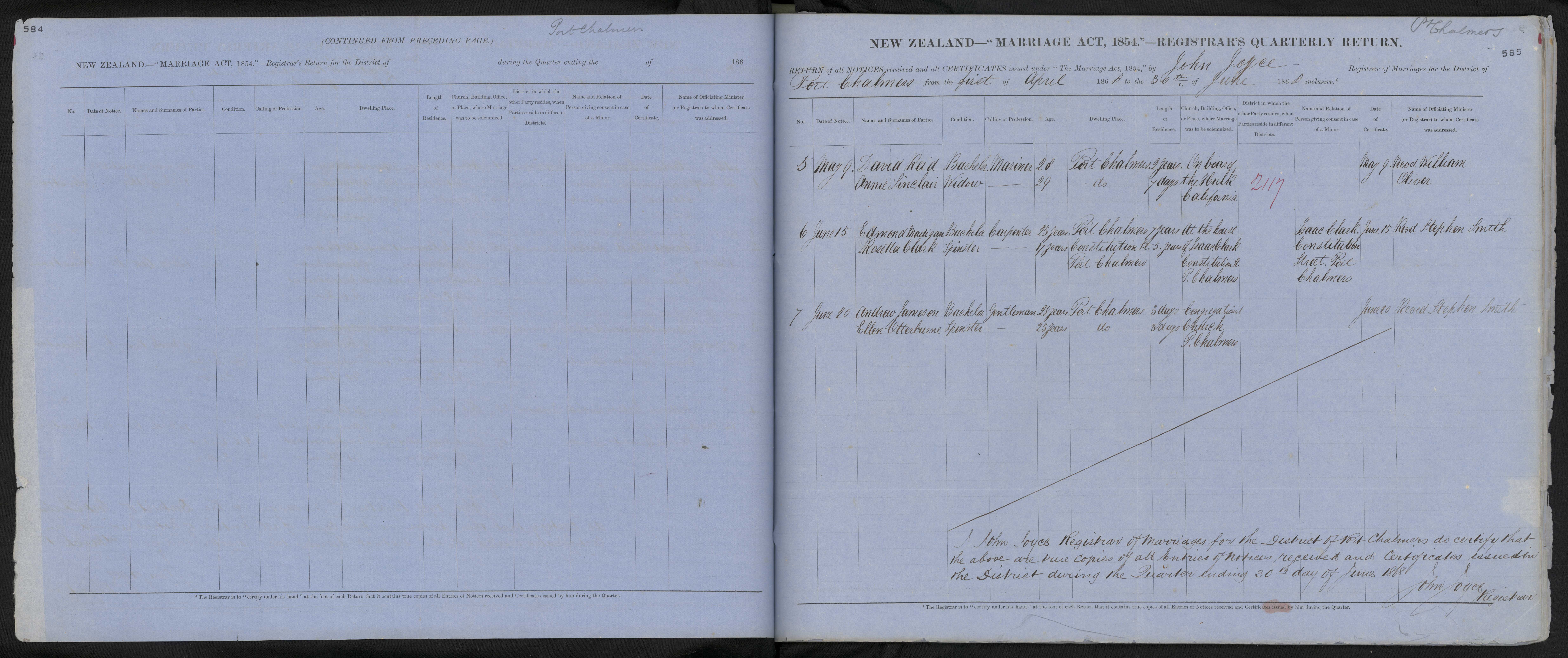District of Port Chalmers Quarter ending 30 June 1868 Registrar John Joyce