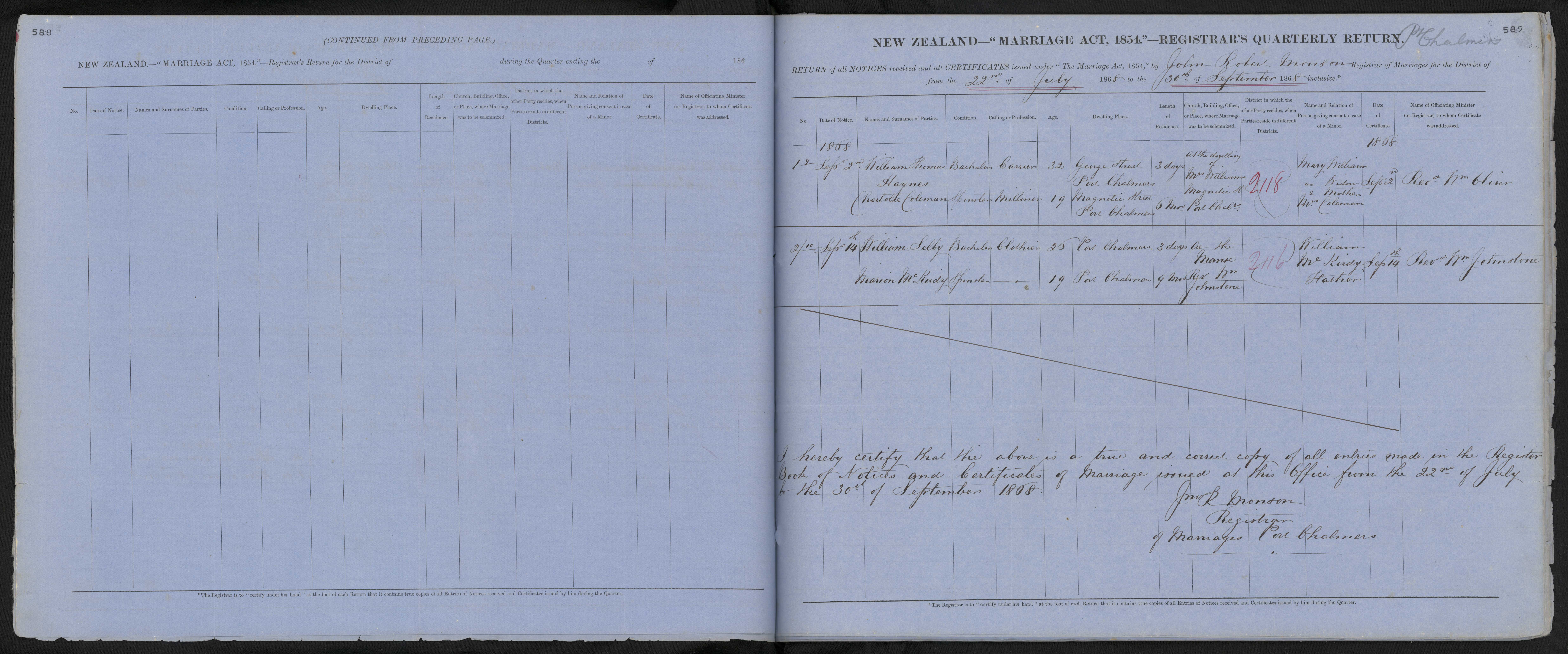 District of Port Chalmers Quarter ending 30 September 1868 Registrar John Joyce