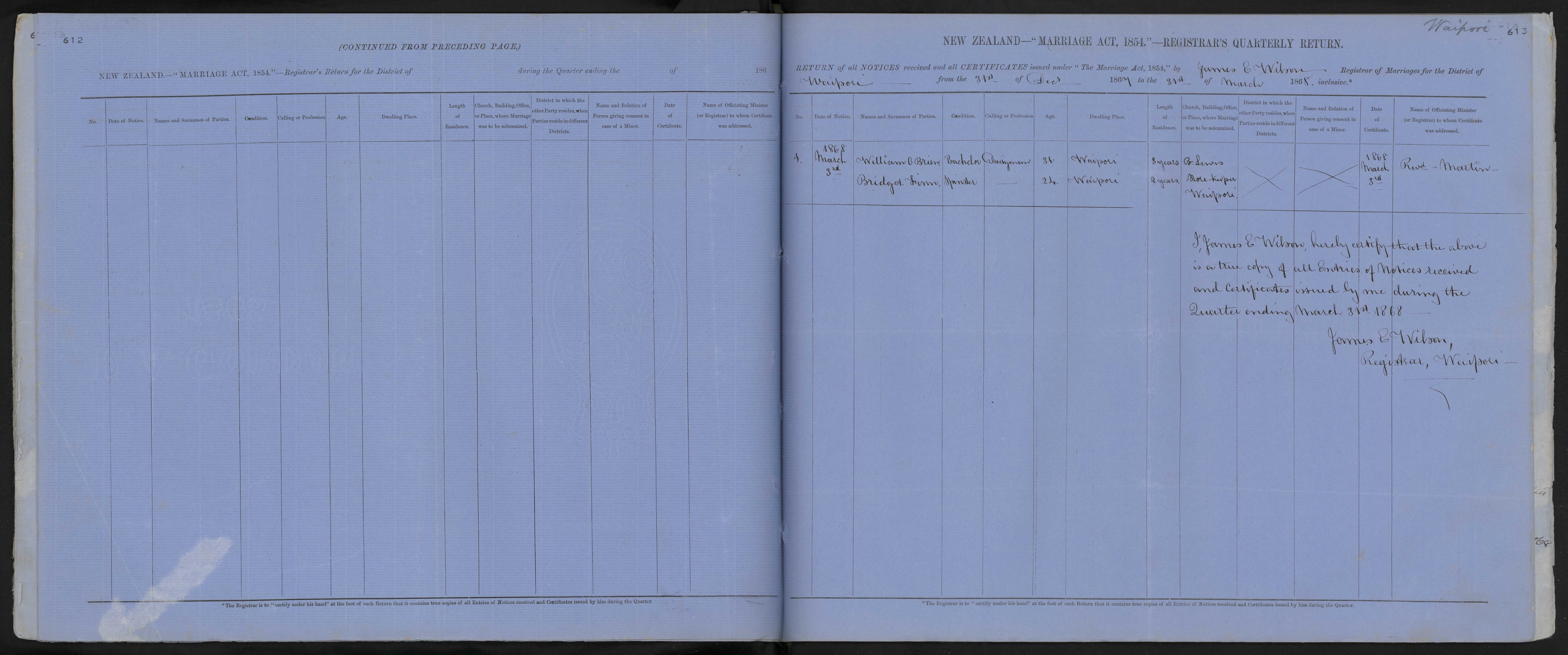 District of Waipori Quarter ending 31 March 1868 Registrar James E Wilson