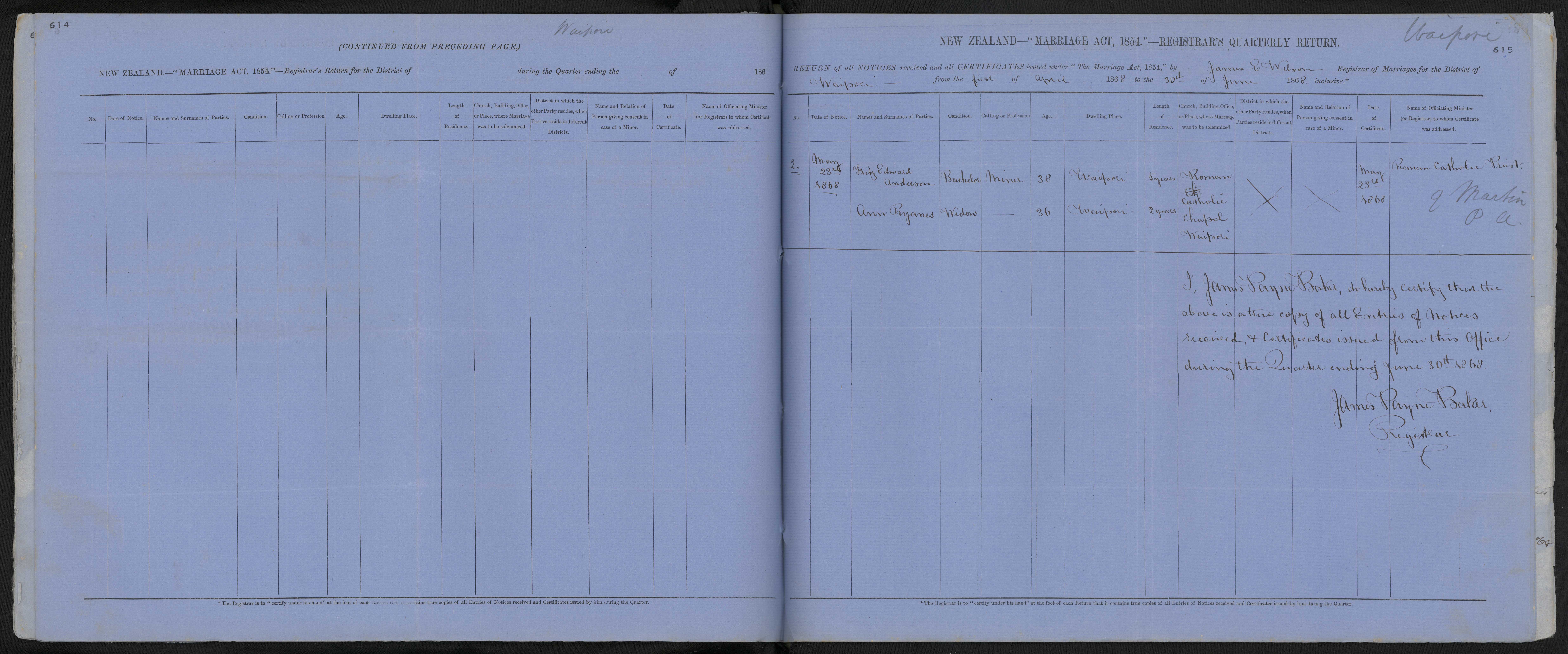 District of Waipori Quarter ending 30 June 1868 Registrar James E Wilson