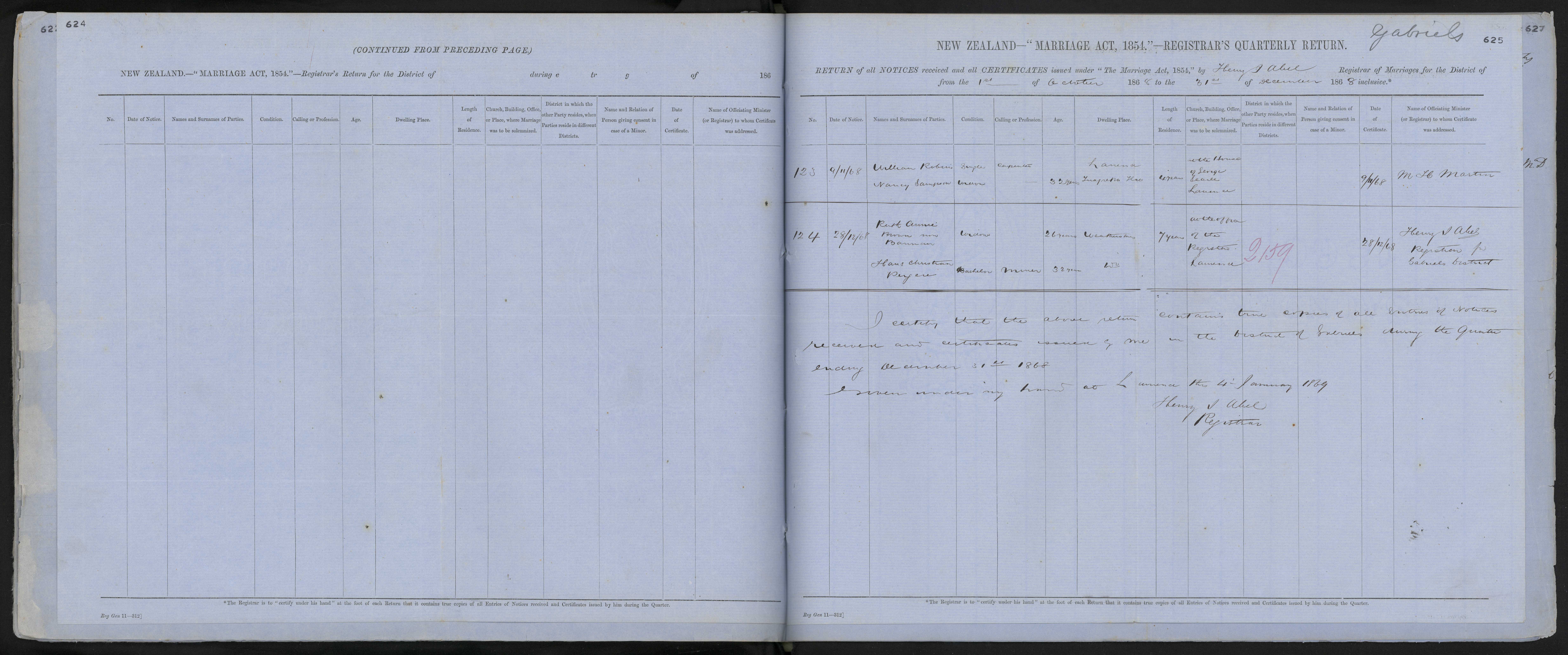 At the Office of the Registrar, Lawrence 68/2159 28 December 1868 Henry J Abel, Registrar for Gabriels District