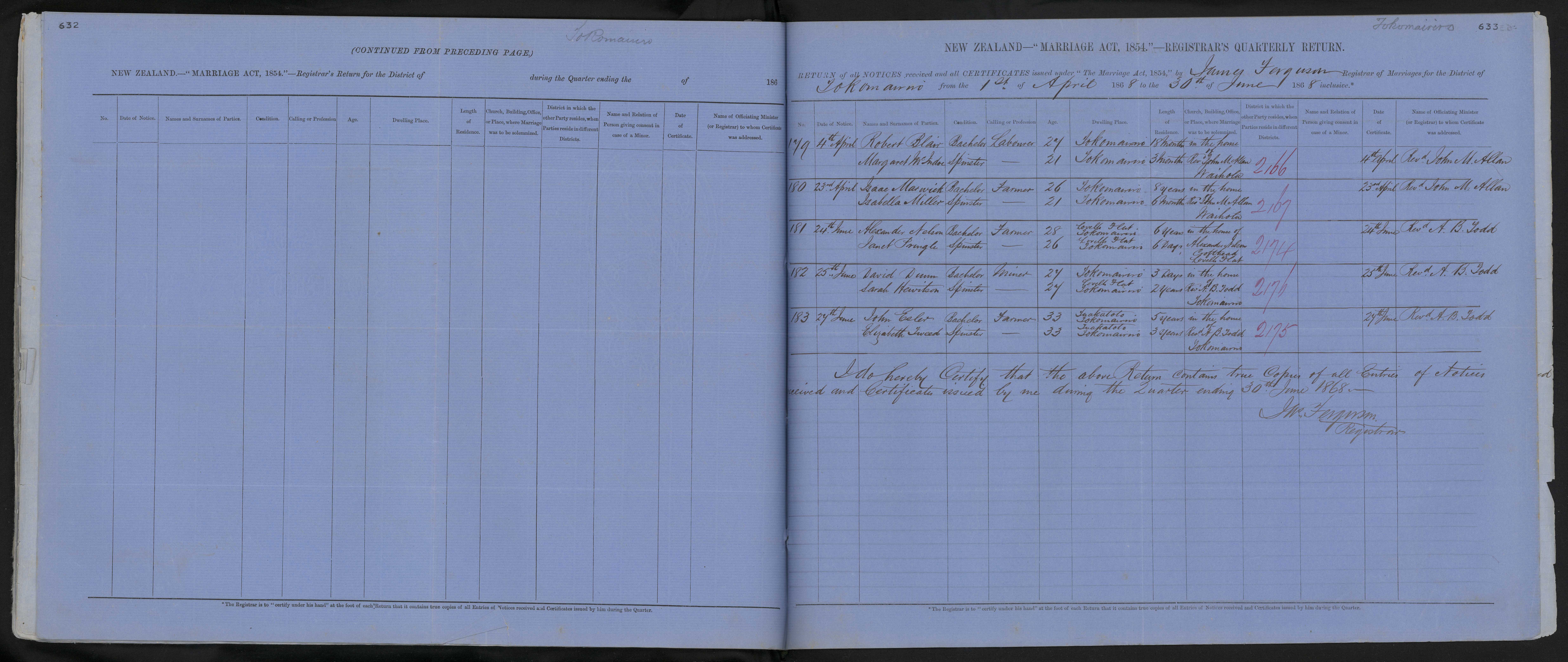 District of Tokomairiro Quarter ending 30 June 1868 Registrar James Ferguson