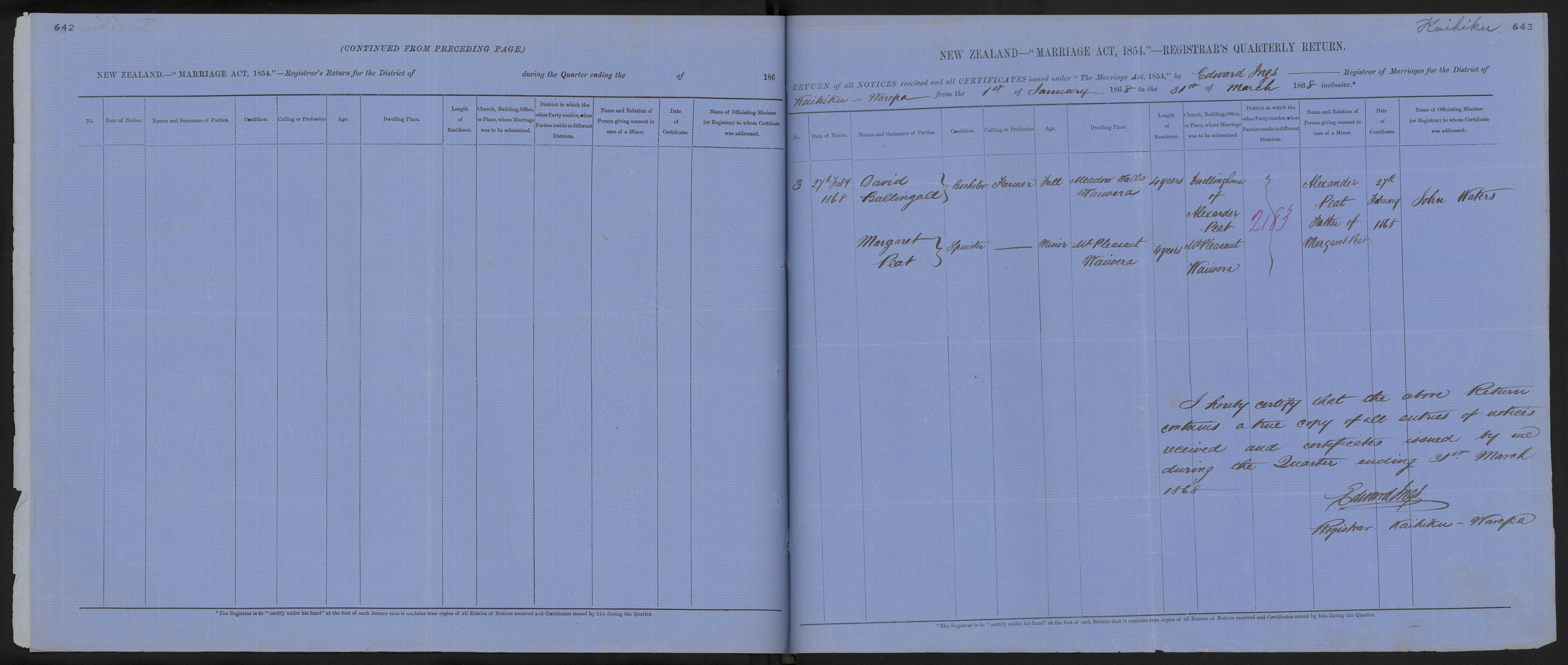 District of Kaihiku-Warepa Quarter ending 31 March 1868 Registrar Edward Ings