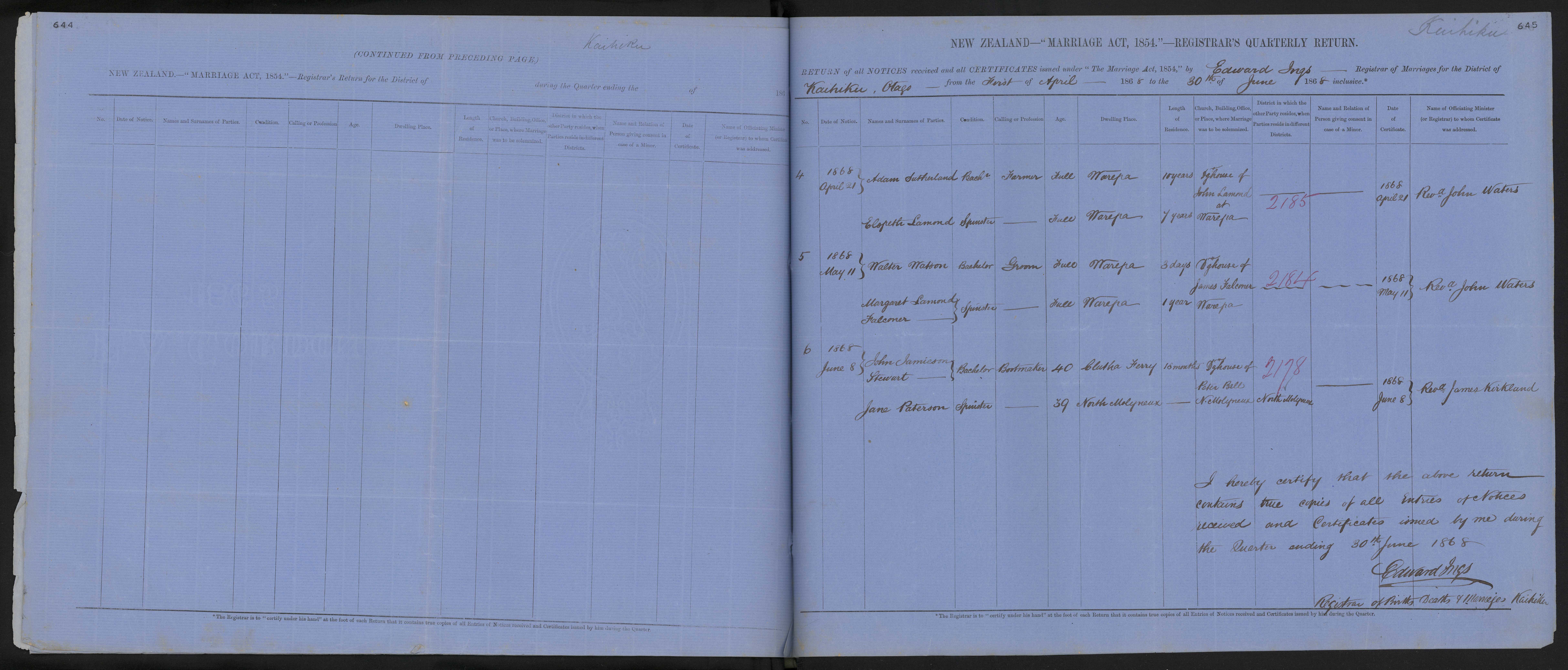 District of Kaihiku Quarter ending 30 June 1868 Registrar Edward Ings