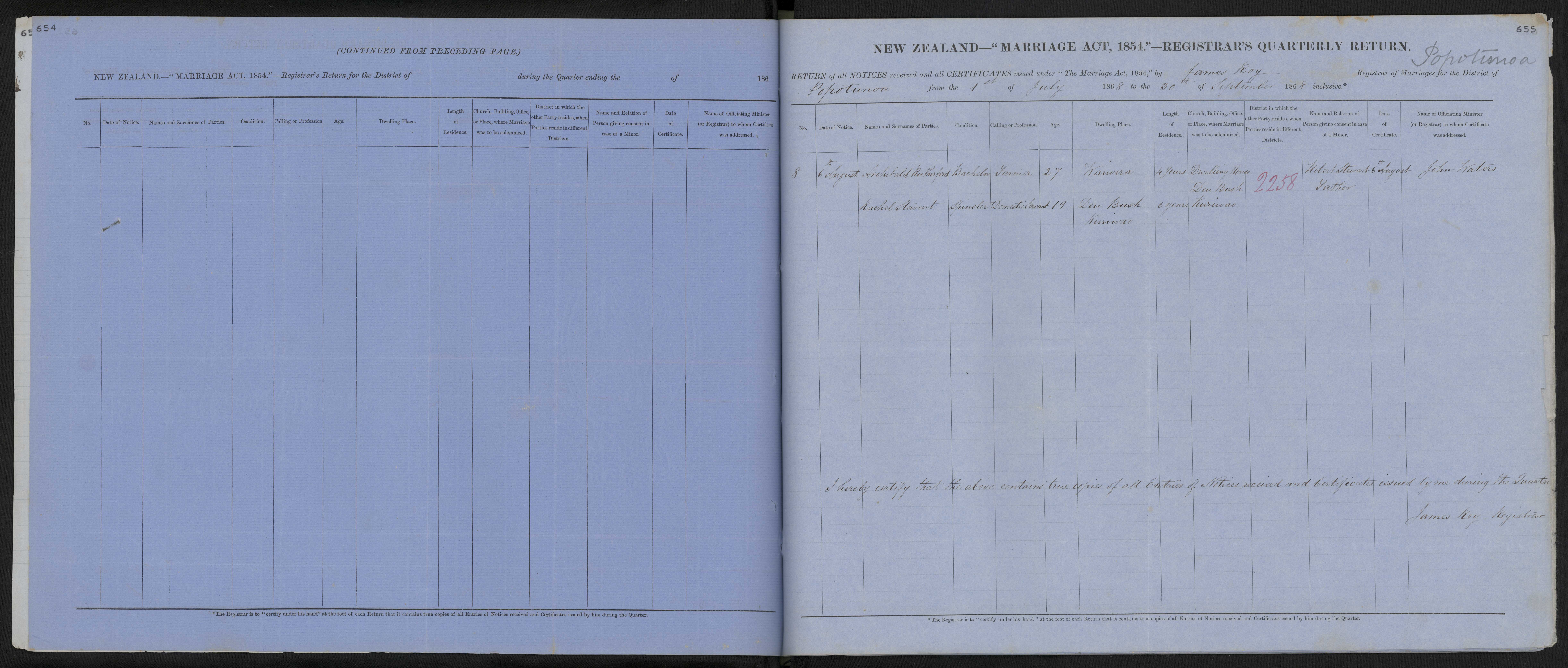 District of Popotunoa Quarter ending 30 September 1868 Registrar James Roy