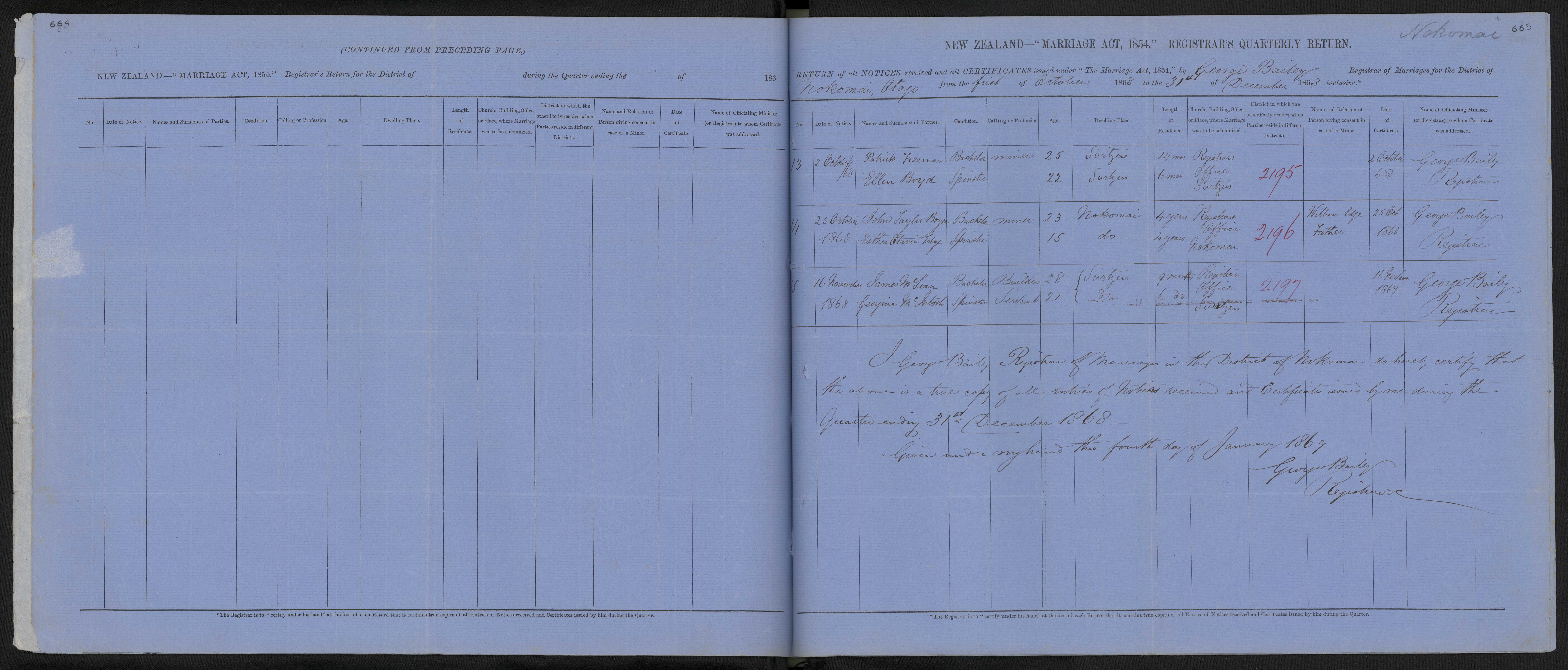 Registrars Office Nokomai 68/2196 William Edge, father 25 October 1868 George Bailey Registrar