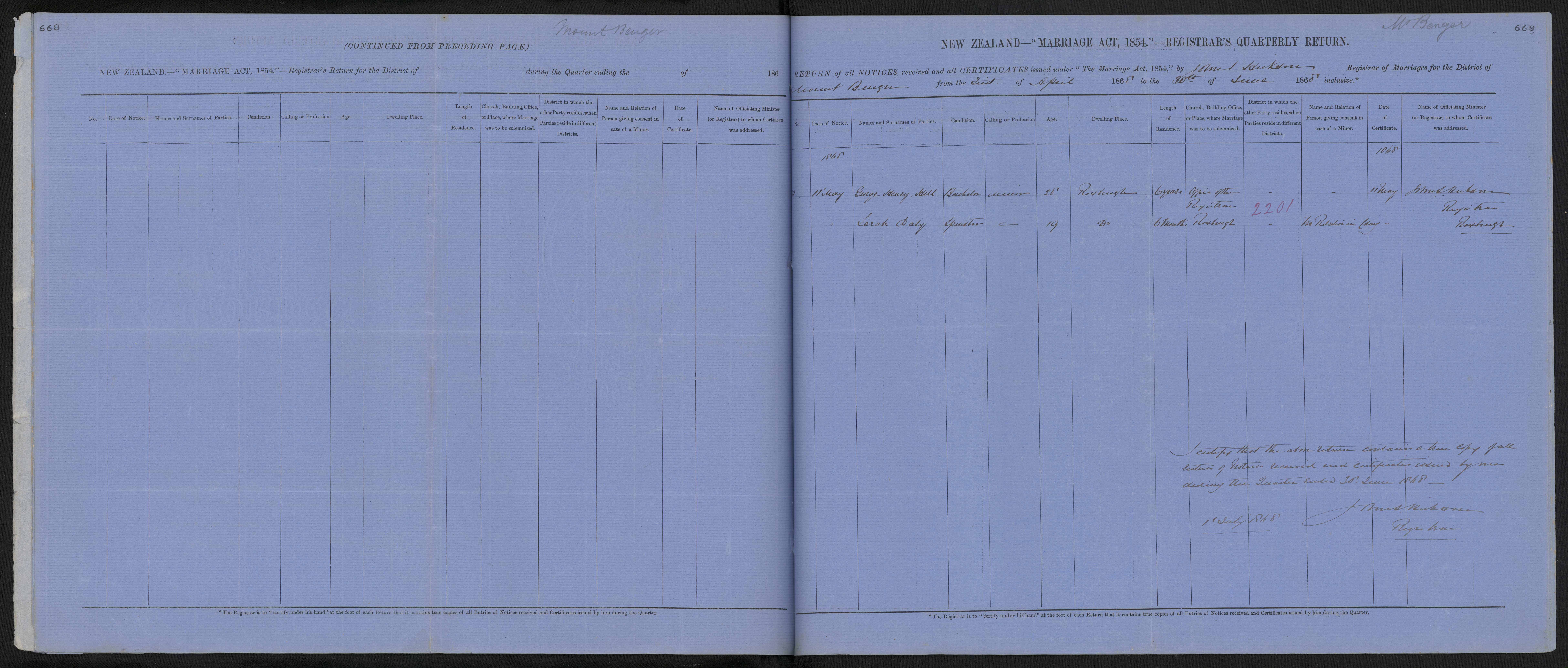District of Mount Benger Quarter ending 30 June 1868 Registrar John S Hickson
