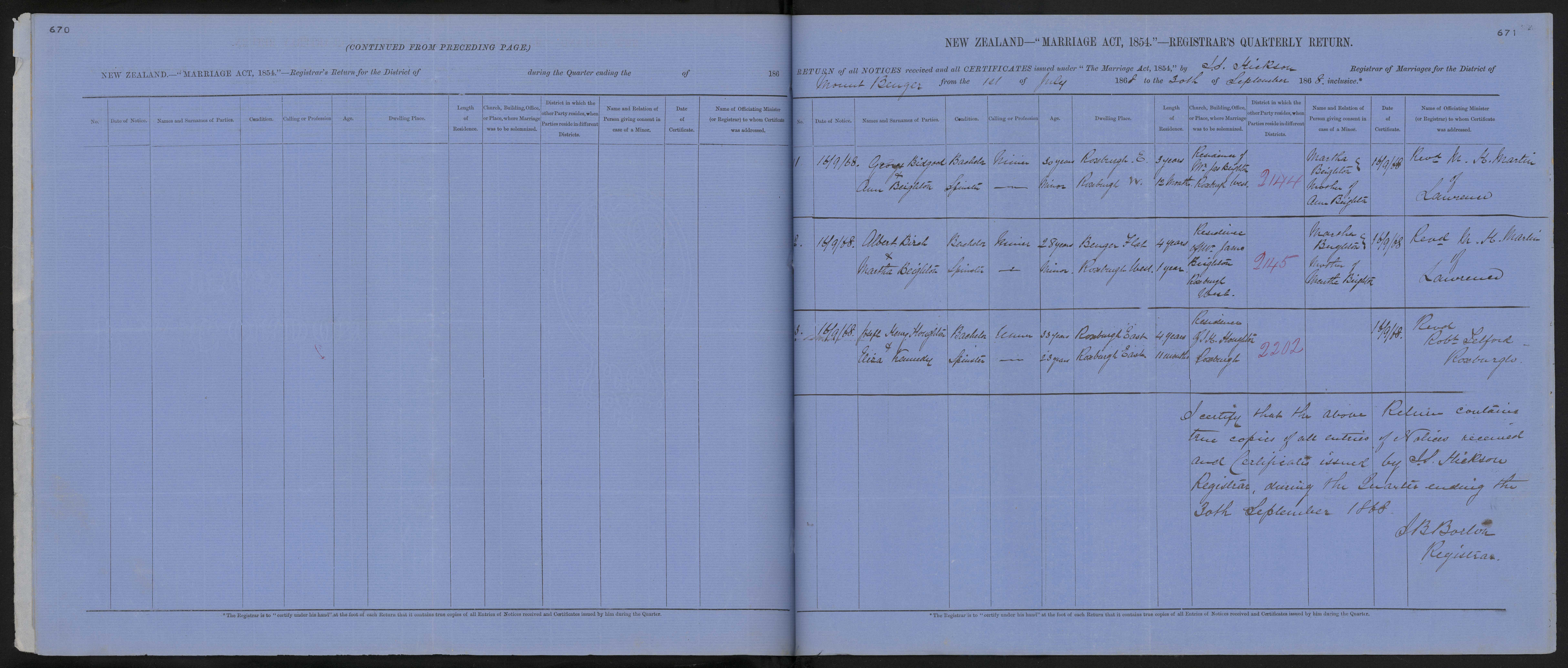 District of Mount Benger Quarter ending 30 September 1868 Registrar J S Hickson