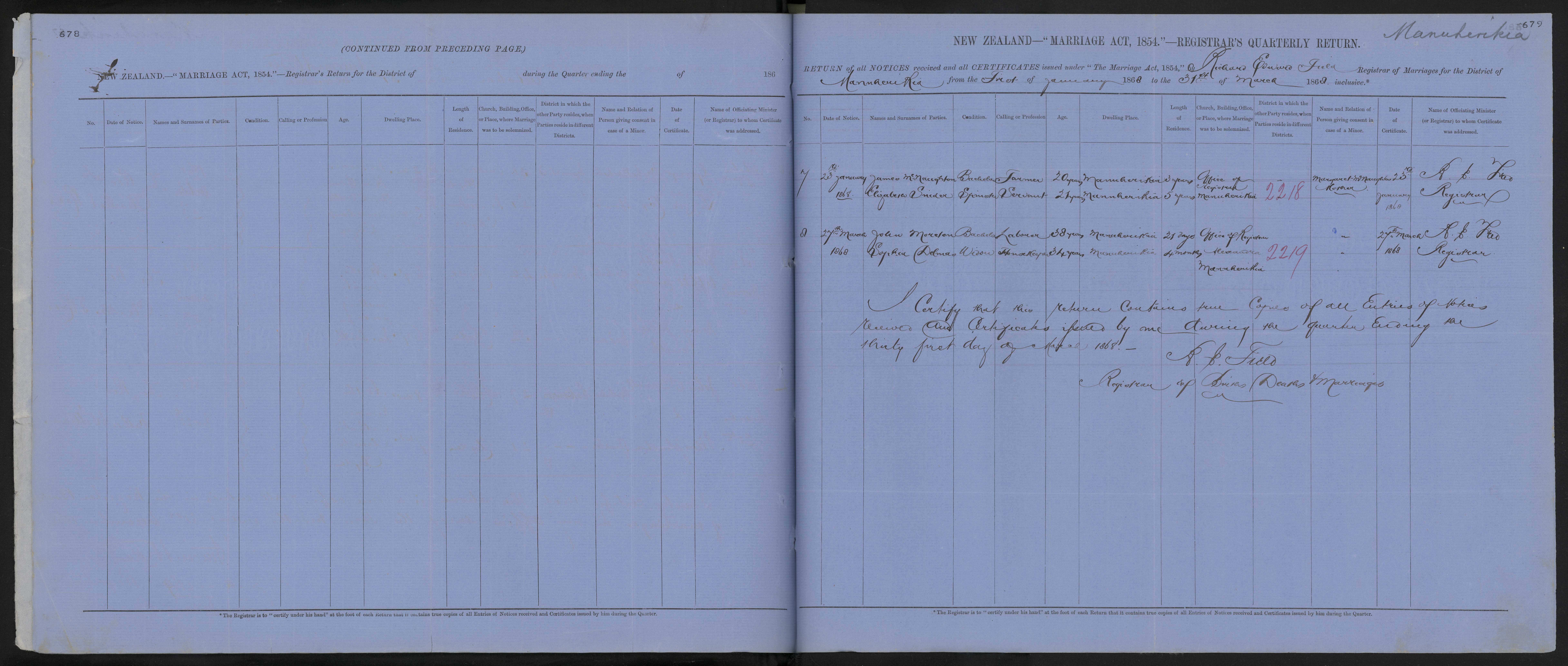 Office of Registrar, Alexandra, Manuherikia 68/2219 27 March 1868 R. E. Field, Registrar