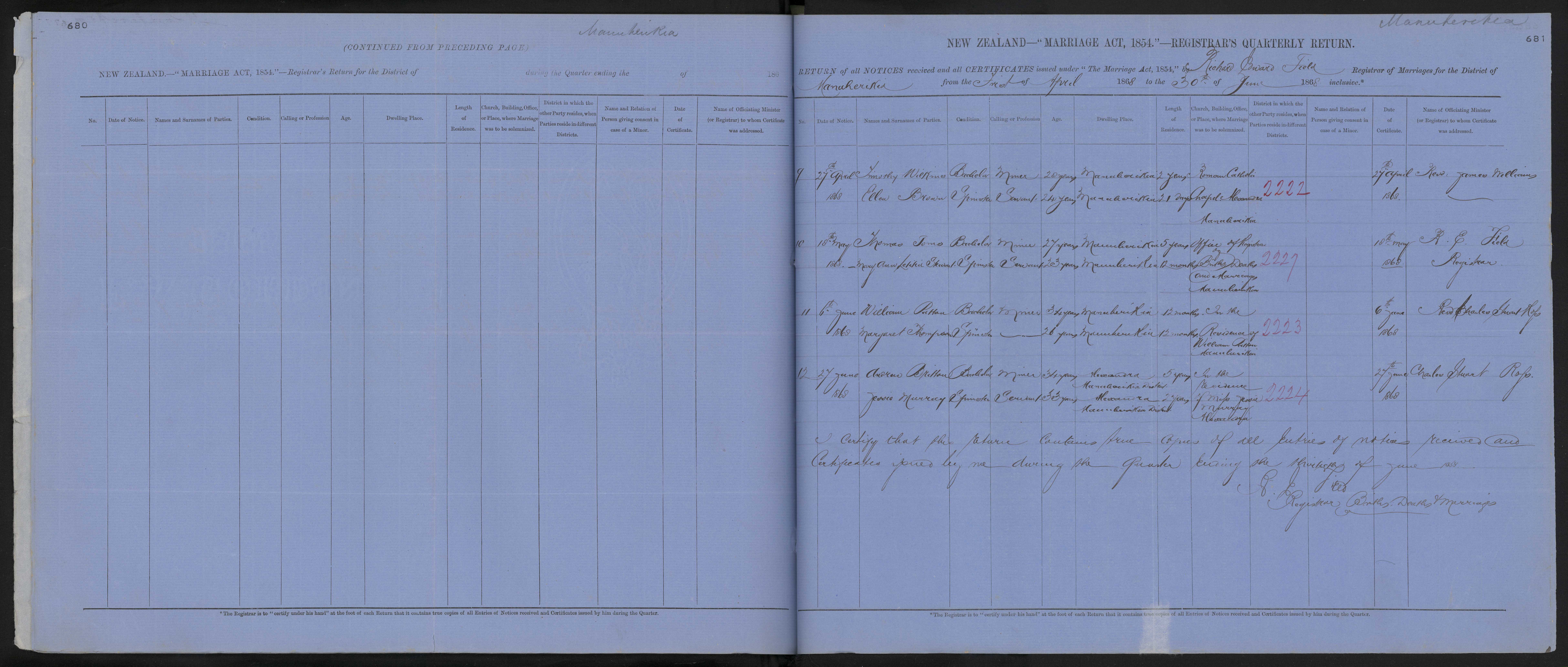 District of Manuherikia Quarter ending 30 June 1868 Registrar Richard Edward Field