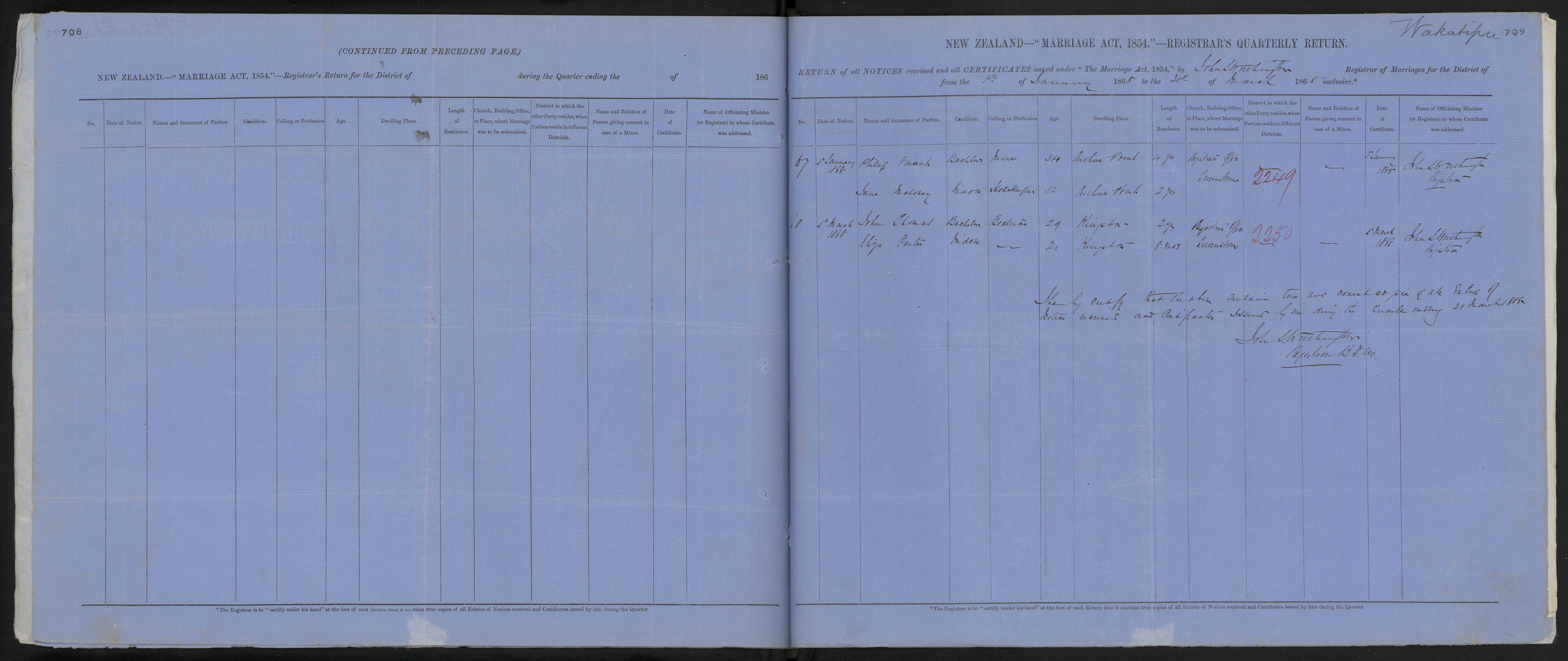 Registrars Office Queenstown 68/2250 5 March 1868 John S Worthington, Registrar