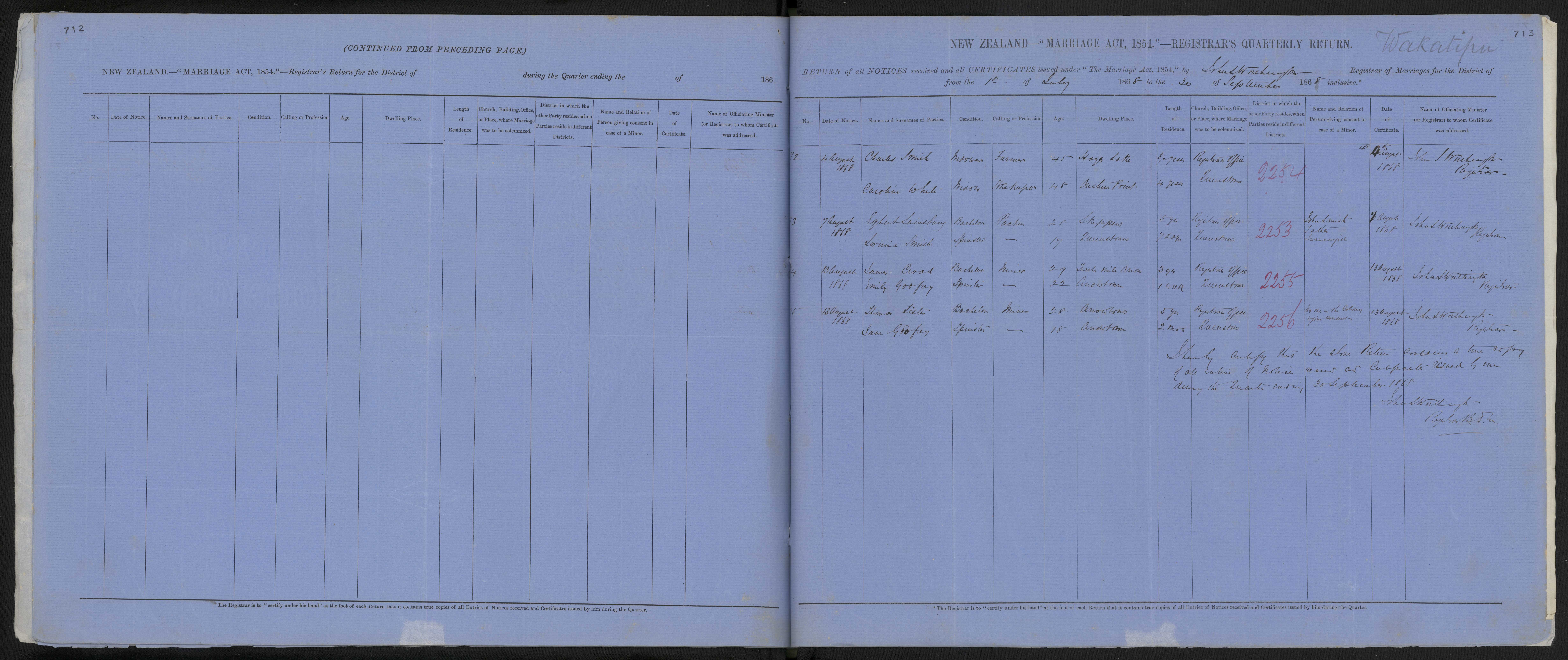 District of Wakatipu Quarter ending 30 September 1868 Registrar John S Worthington