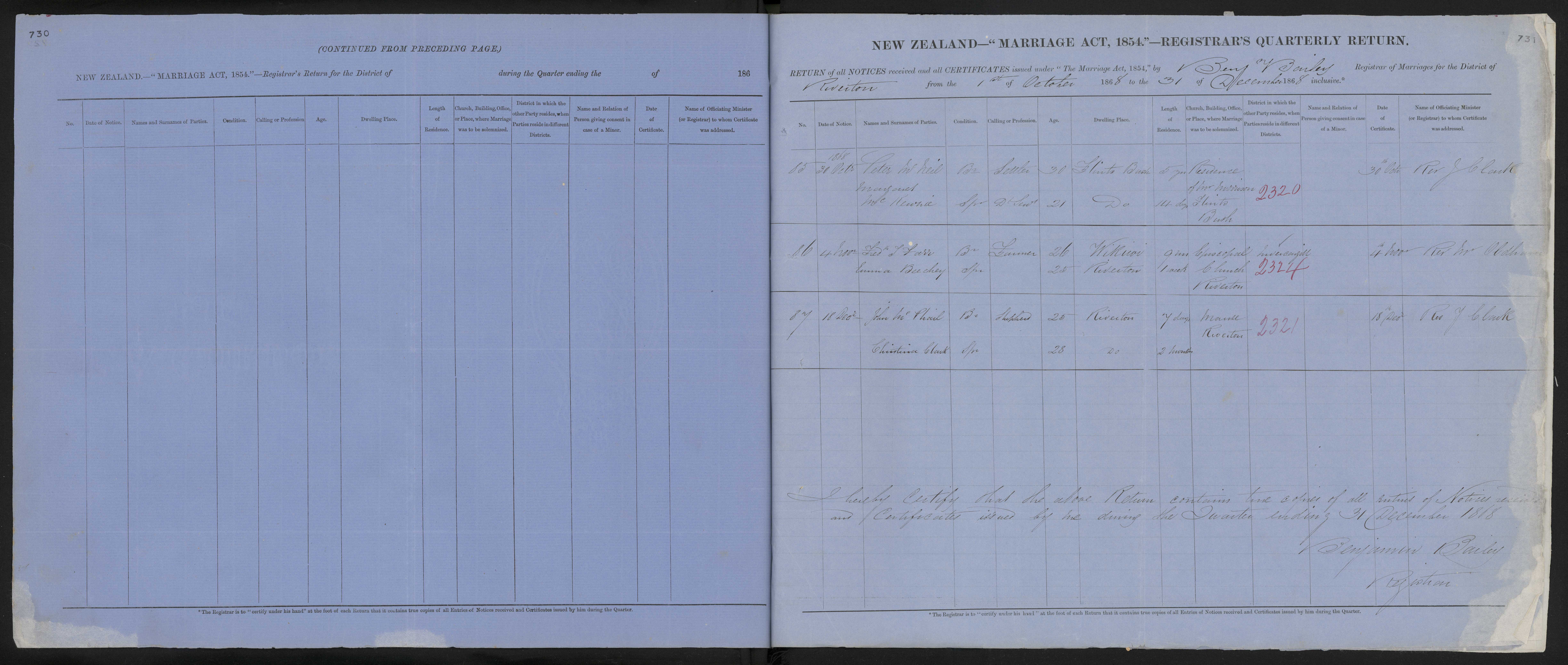 District of Riverton Quarter ending 31 Dec 1868 Registrar Benj Bailey
