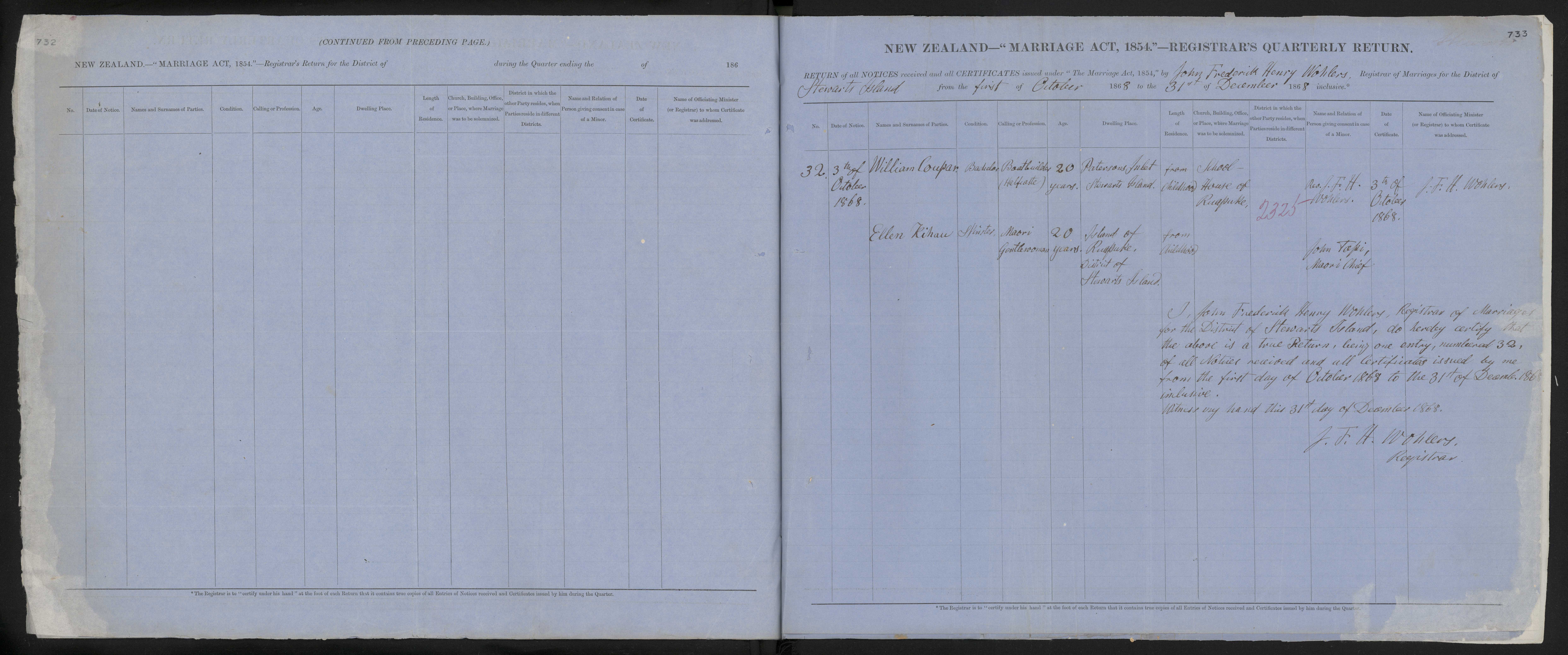 District of Stewart Island Quarter ending 31 Dec 1868 Registrar John Frederick Henry Wohlers