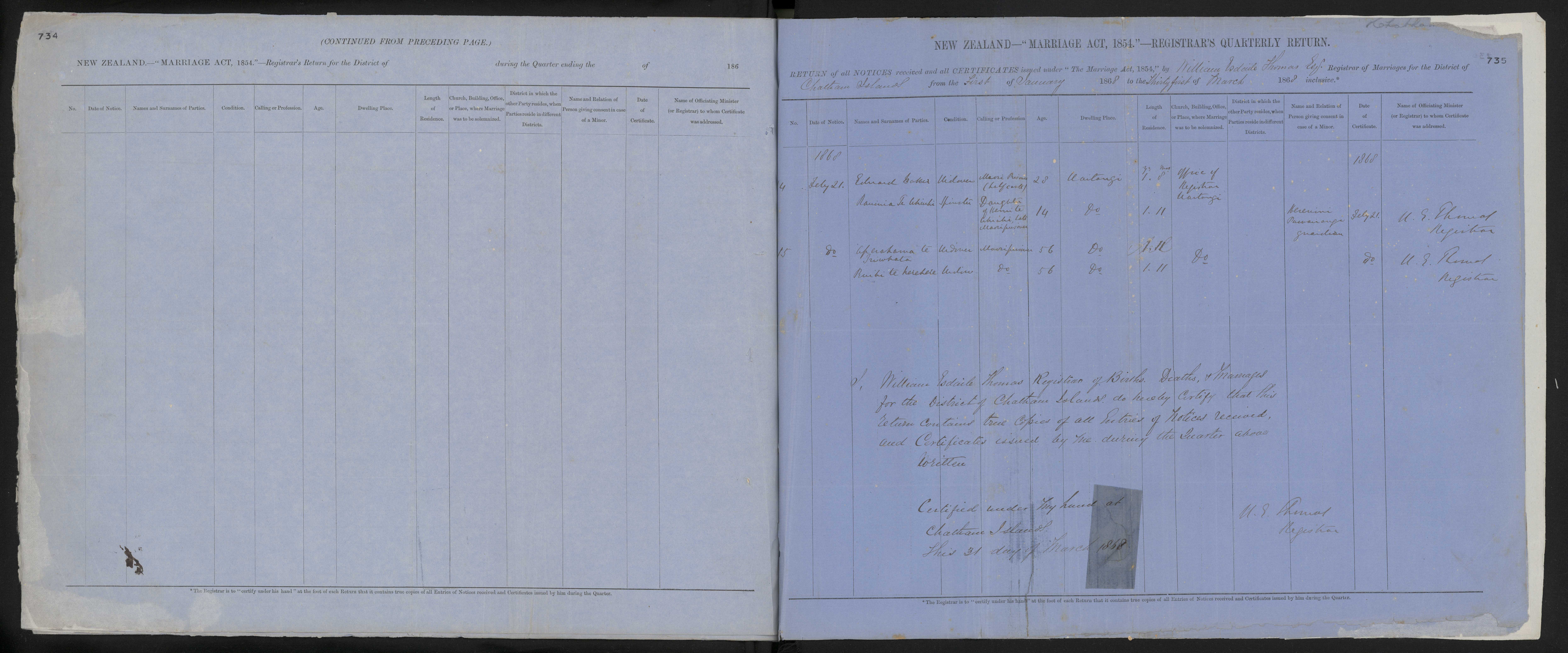 District of Chatham Islands Quarter ending 31 March 1868 Registrar William Esdaile Thomas Esq.