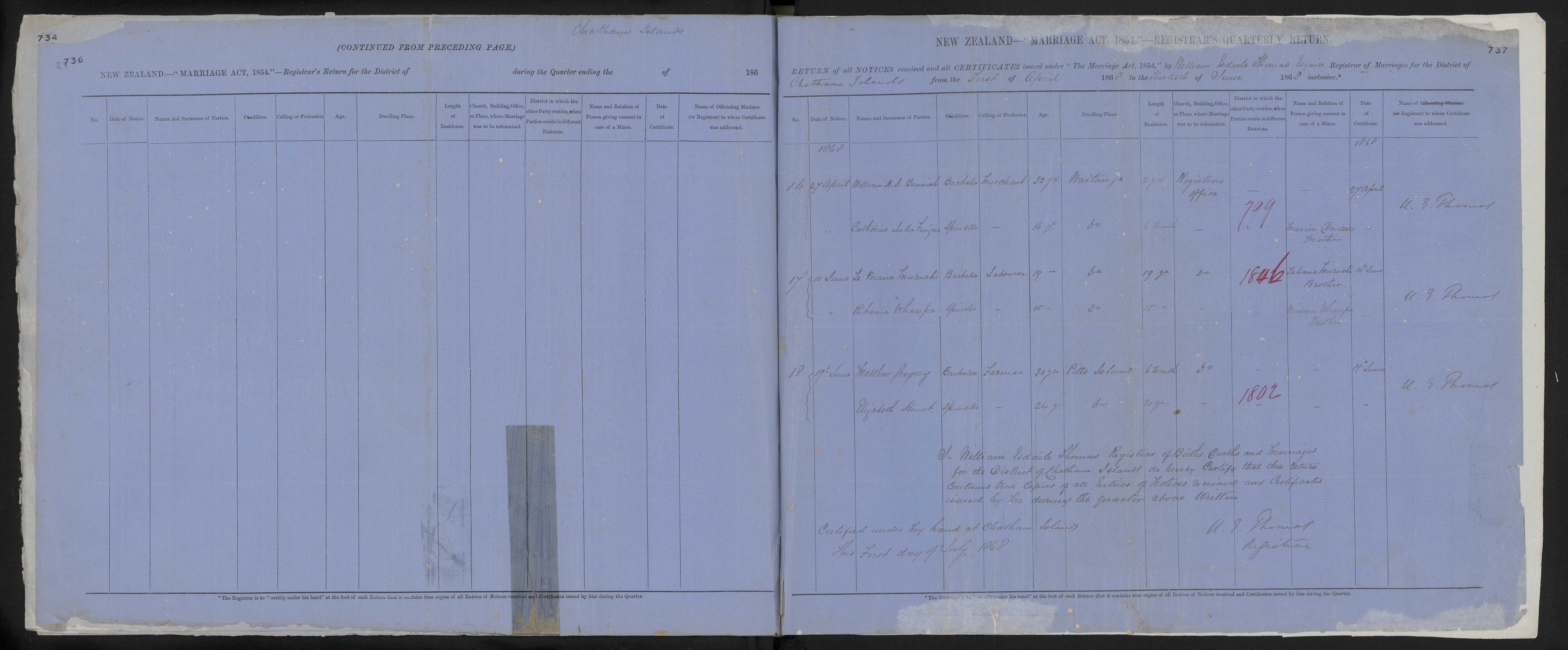 District of Chatham Islands Quarter ending 30 June 1868 Registrar William Esdaile Thomas Esquire