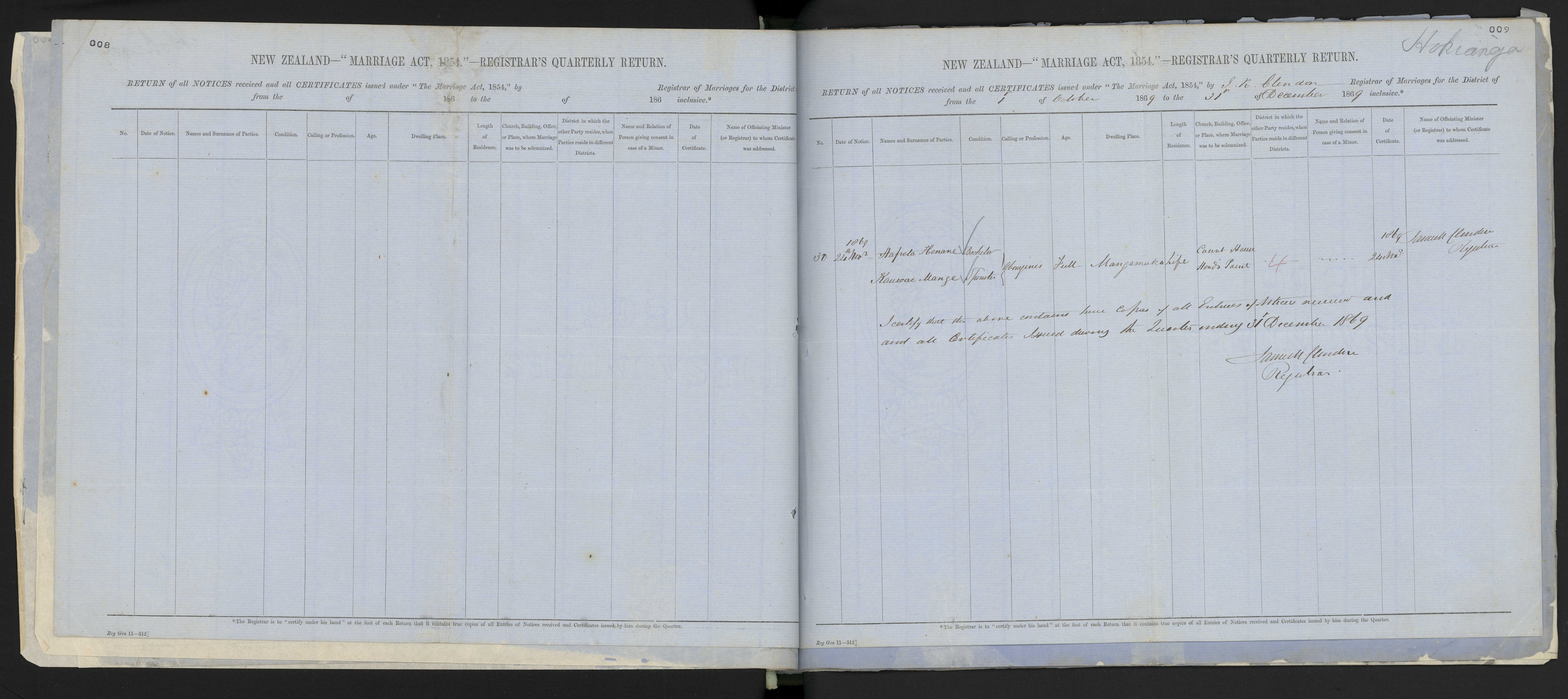 District of Hokianga Quarter ending 31 December 1869 Registrar J. R. Clendon
