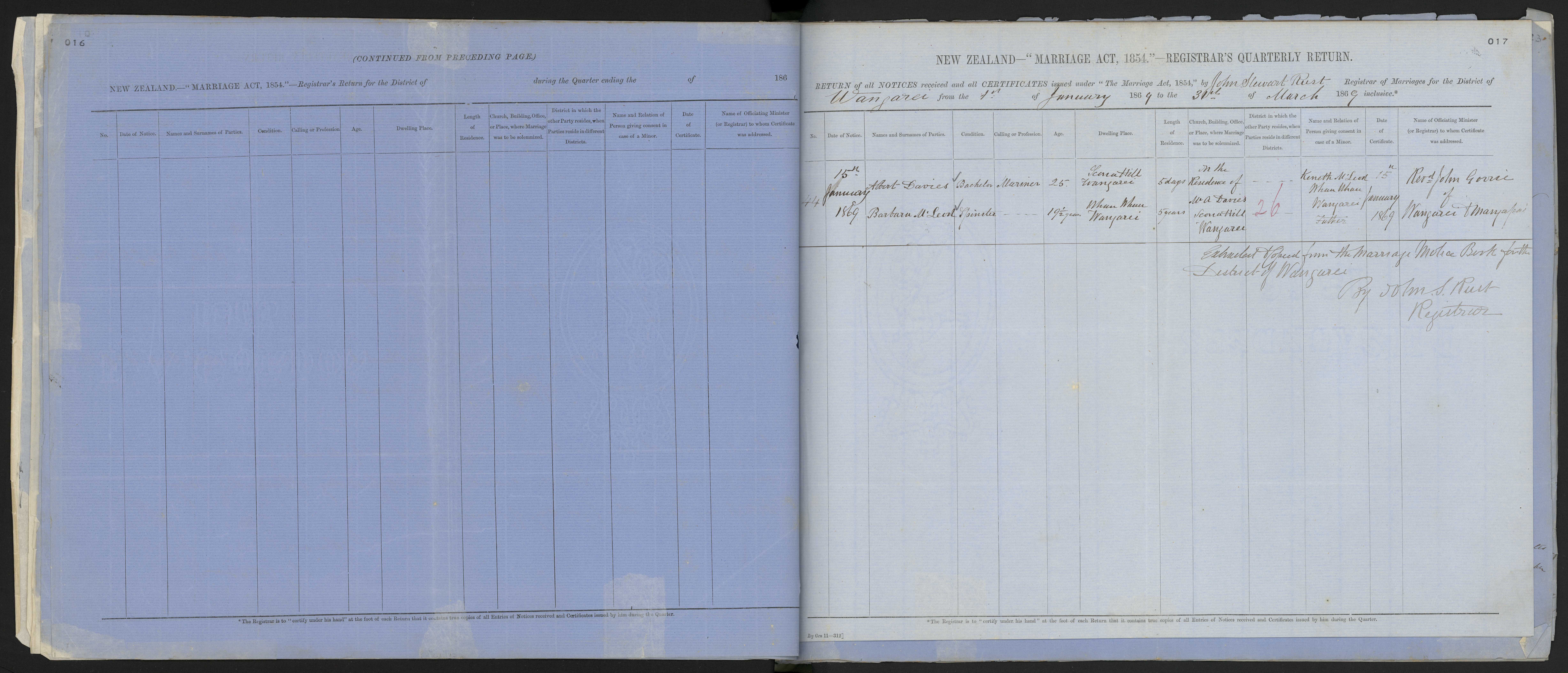 District of Whangarei Quarter ending 31 March 1869 Registrar John Stewart Rust