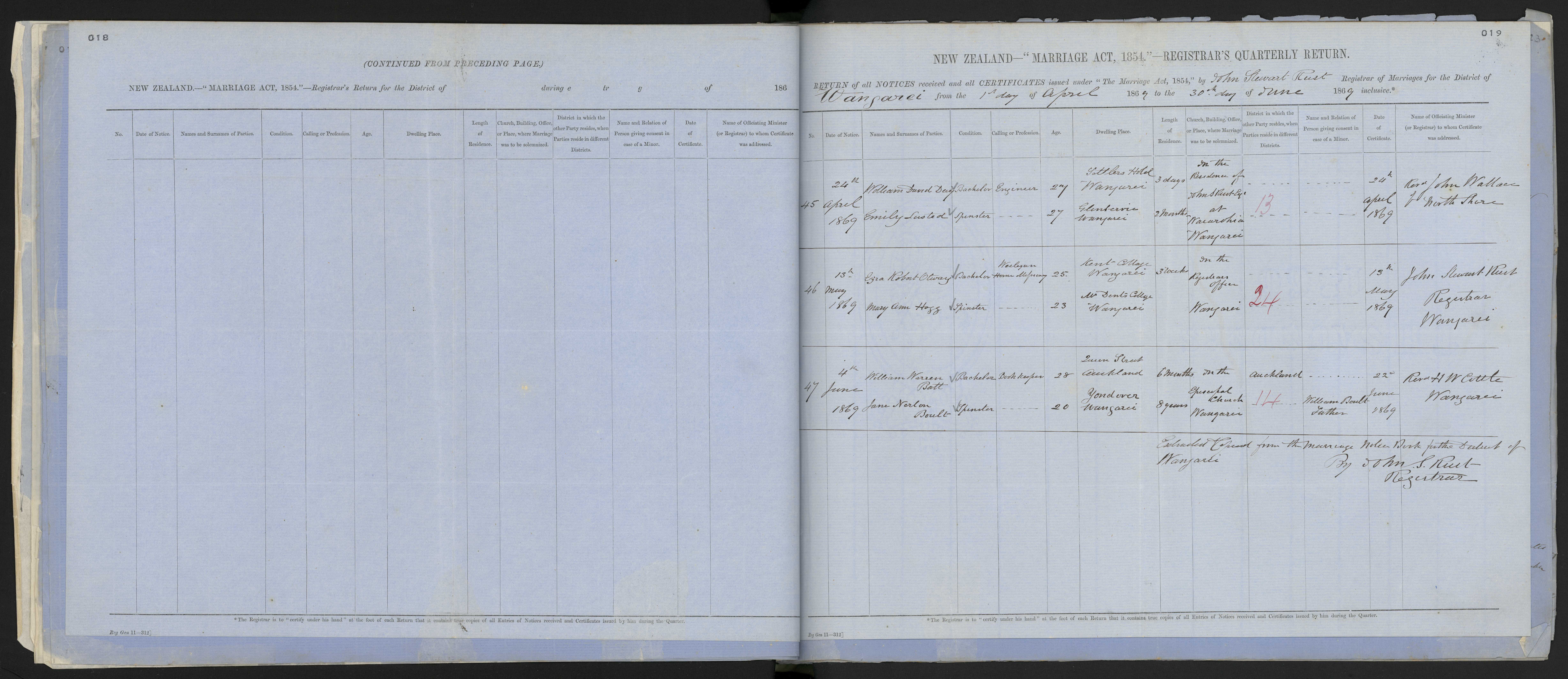 District of Wangarei Quarter ending 30 June 1869 Registrar John Stewart Rust