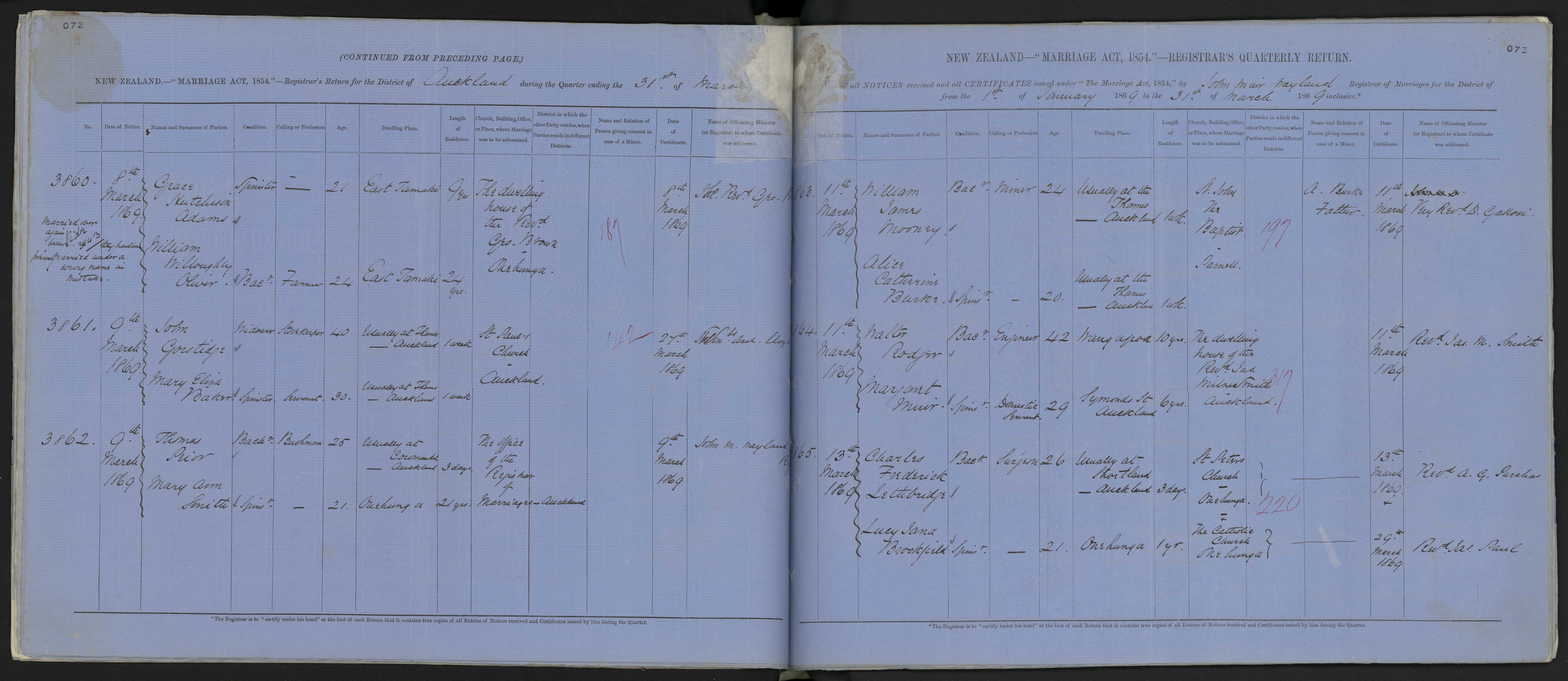 The office of the Registrar of Marriages - Auckland 9 March 1869 John M. Naylan