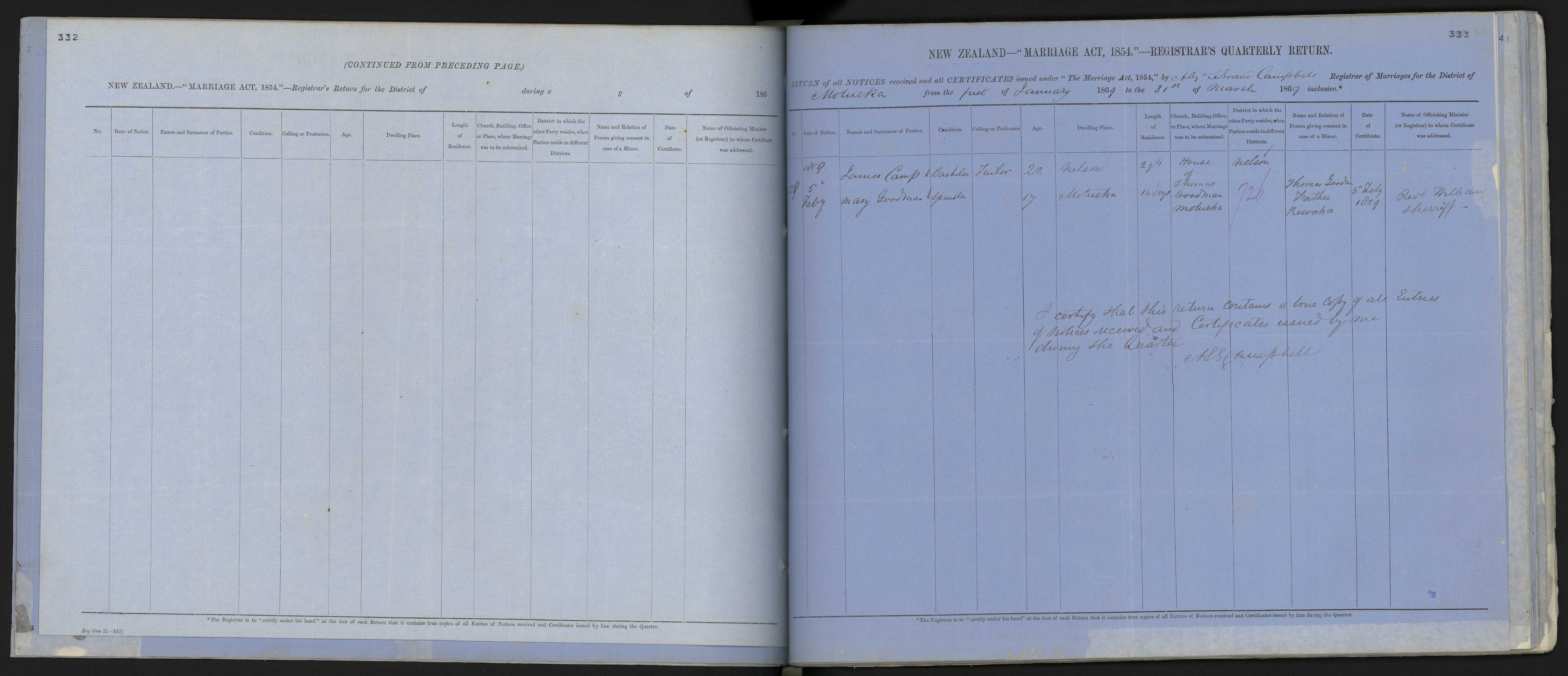 House of Thomas Goodman, Motueka 726 Thomas Goodman, Father of bride, Riwaka 5 Feby 1869 Rev. William Sherriff