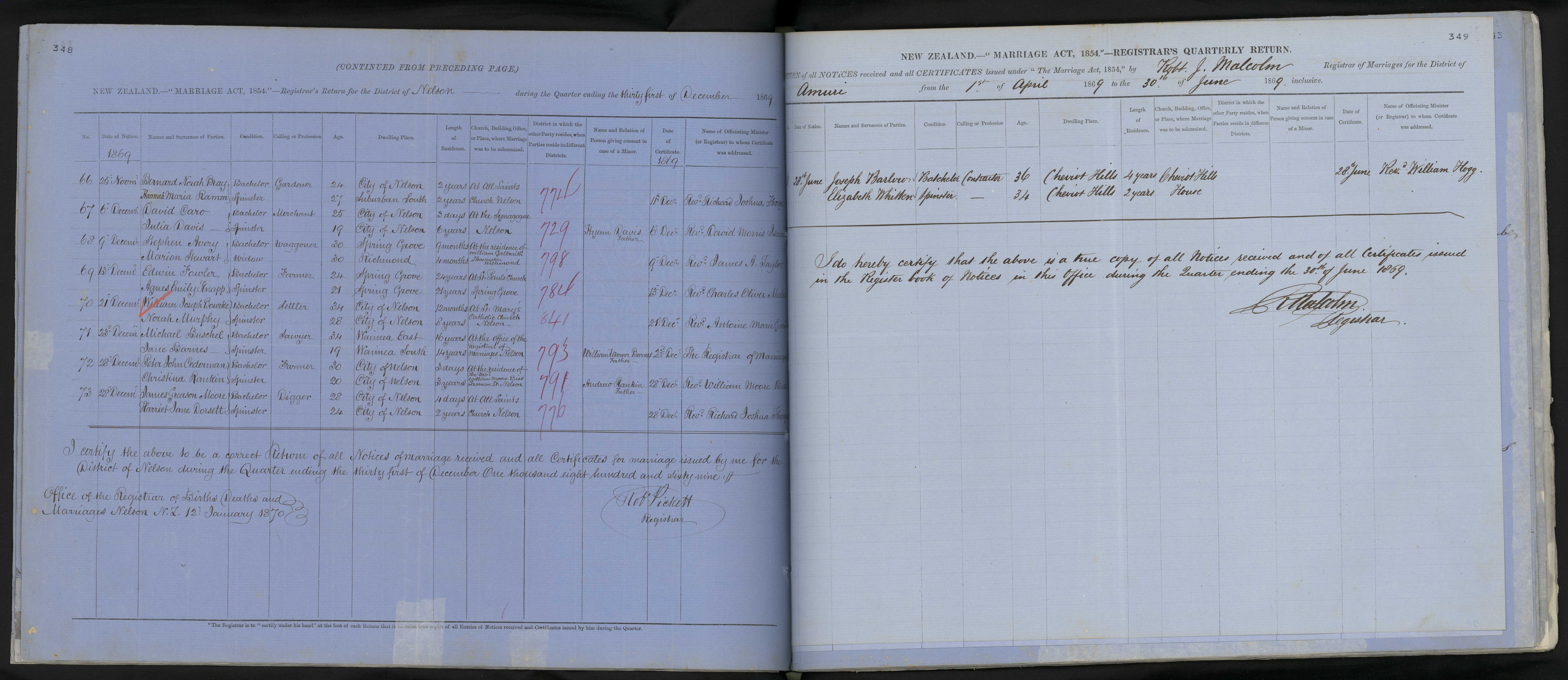 At the office of the Registrar of marriages, Nelson | 793 | William Taviner Barnes, father | 23 December 1869 | The Registrar of marriages | |||||||||||||||||||||||||||||||||||||||||||||||||