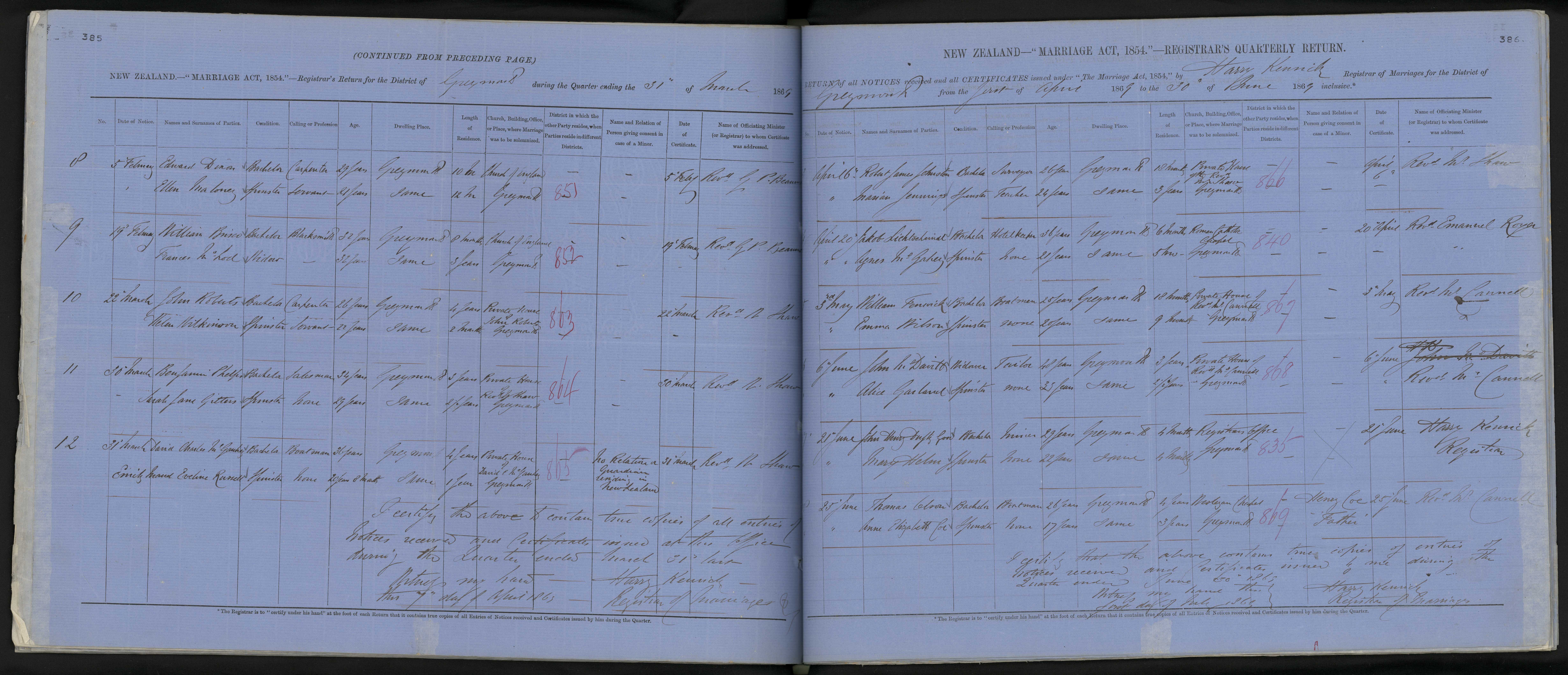 District of Greymouth Quarter ending 31 March 1869 Registrar Harry Kenrick