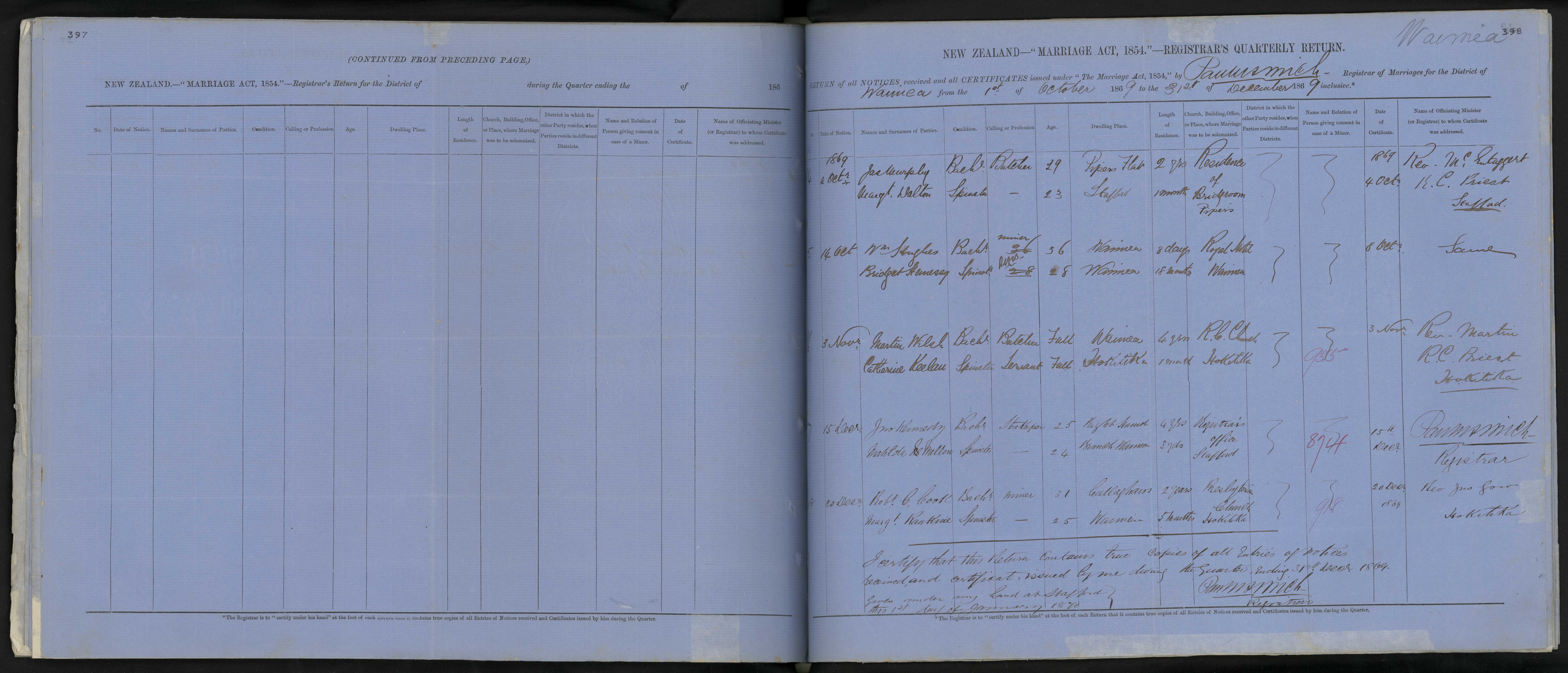 Residence of Bridegroom Pipers 4 October 1869 Rev. McEntaggart, R C Priest, Stafford
