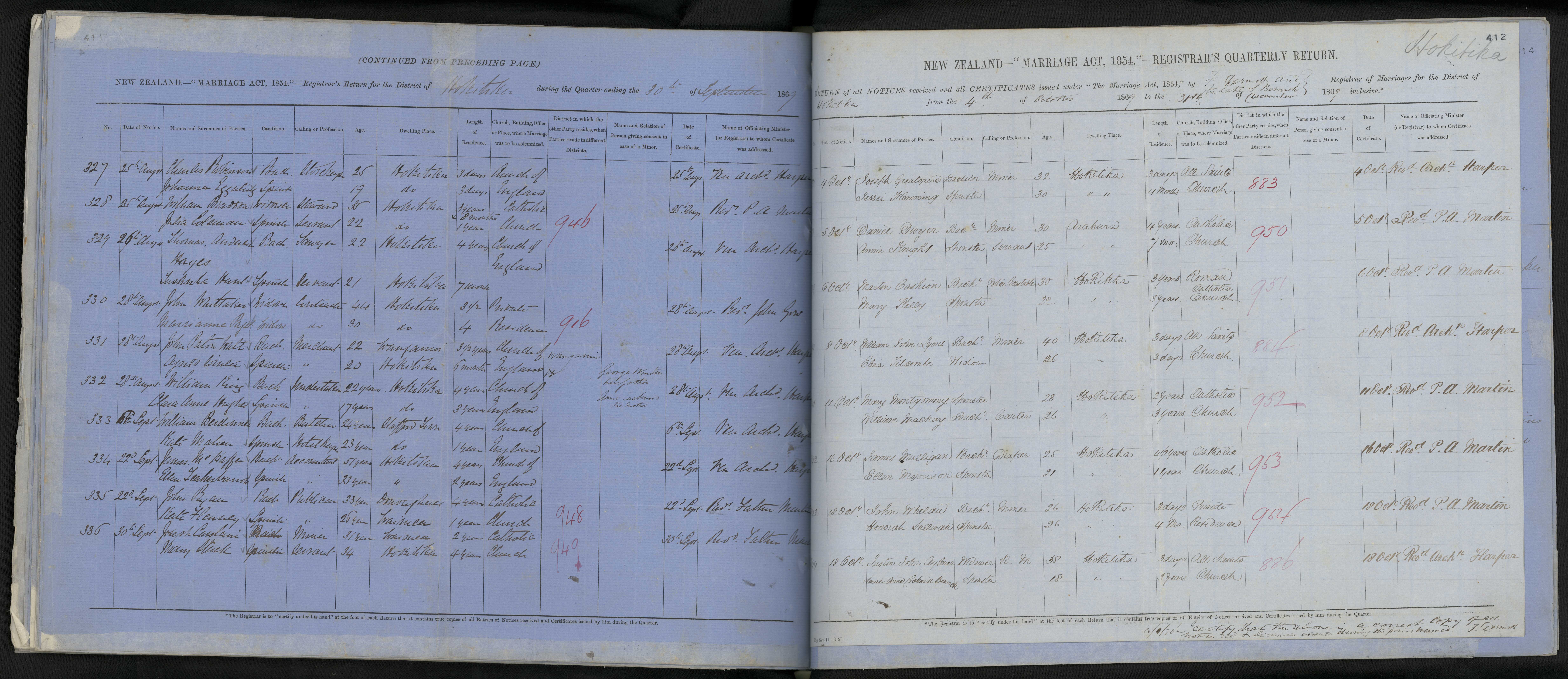 District of Hokitika Quarter ending 31 December 1869 Registrar F Dermott and the late S Beswick| No | Date of Notice | Names and Surnames of Parties | BDM Match | Condition | Calling or Profession | Age | Dwelling Place | Length of Residence | Marriage Place | Folio | Consent | Date of Certificate | Officiating Minister | ||||||||||||||||||||||||||||||||||||||||||||||||