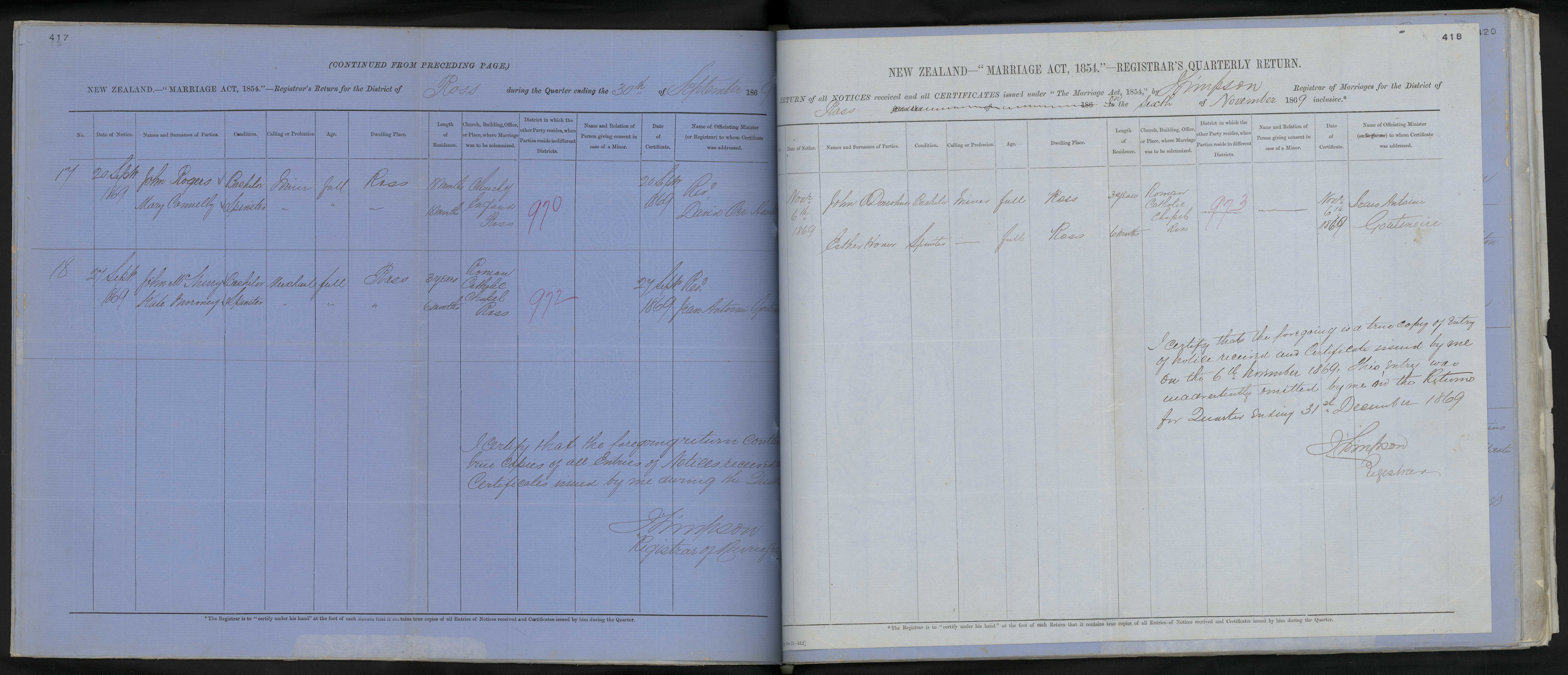 District of Ross Quarter ending 6 November 1869 Registrar J Simpson