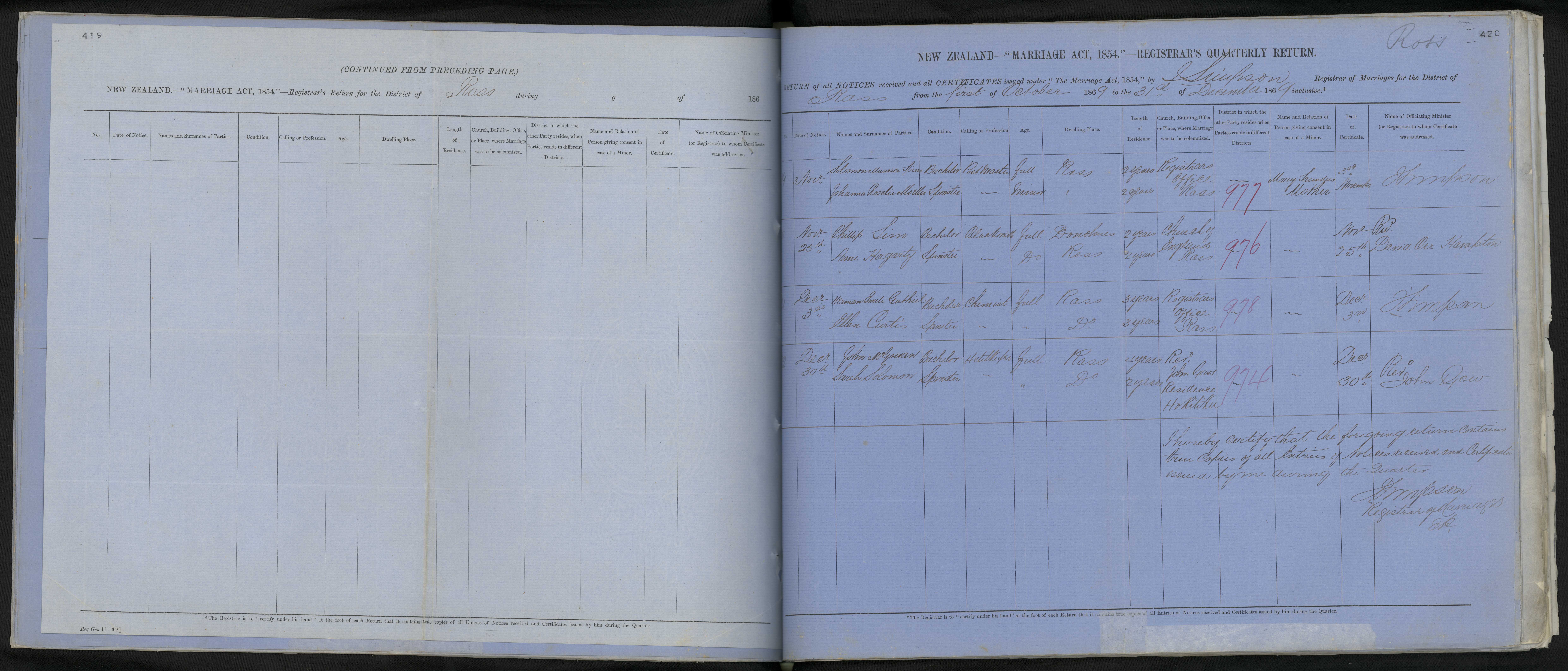 District of Ross Quarter ending 31 December 1869 Registrar J Simpson