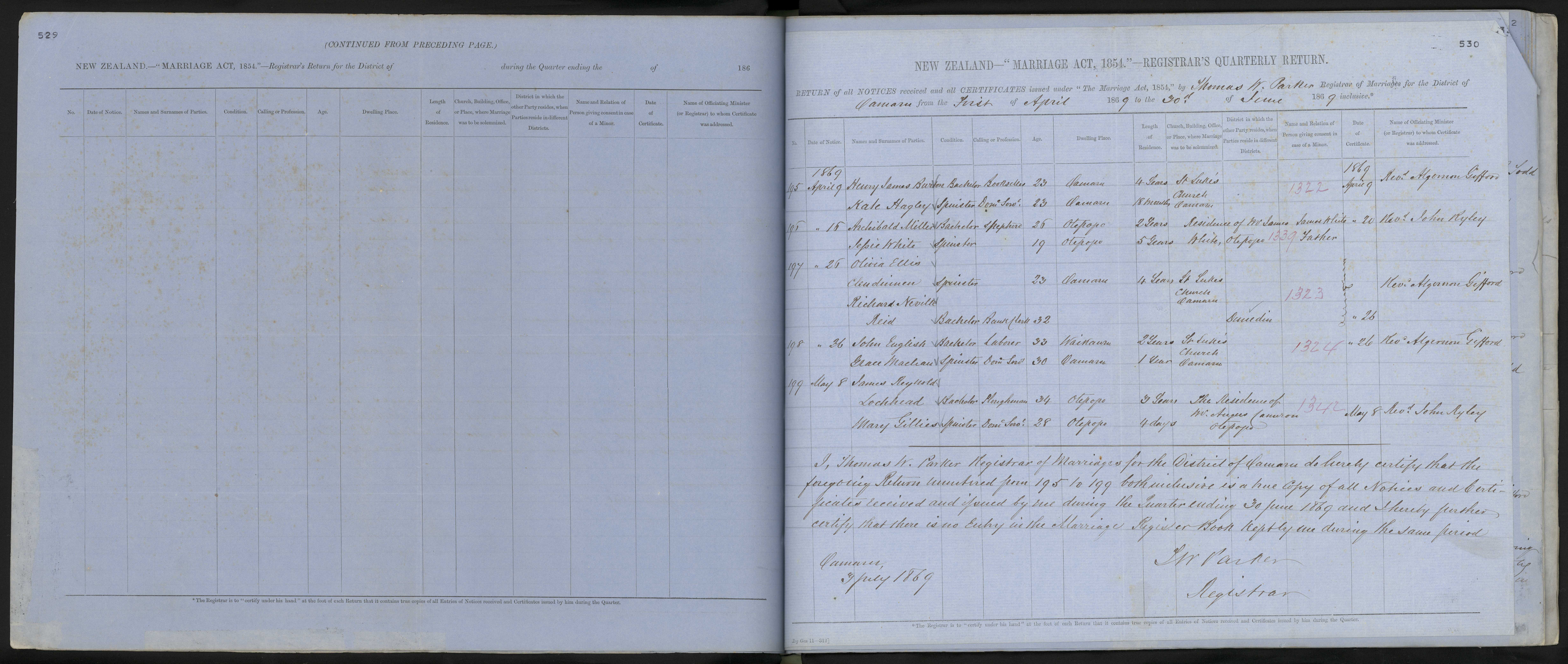 District of Oamaru Quarter ending 30 June 1869 Registrar Thomas W Parker